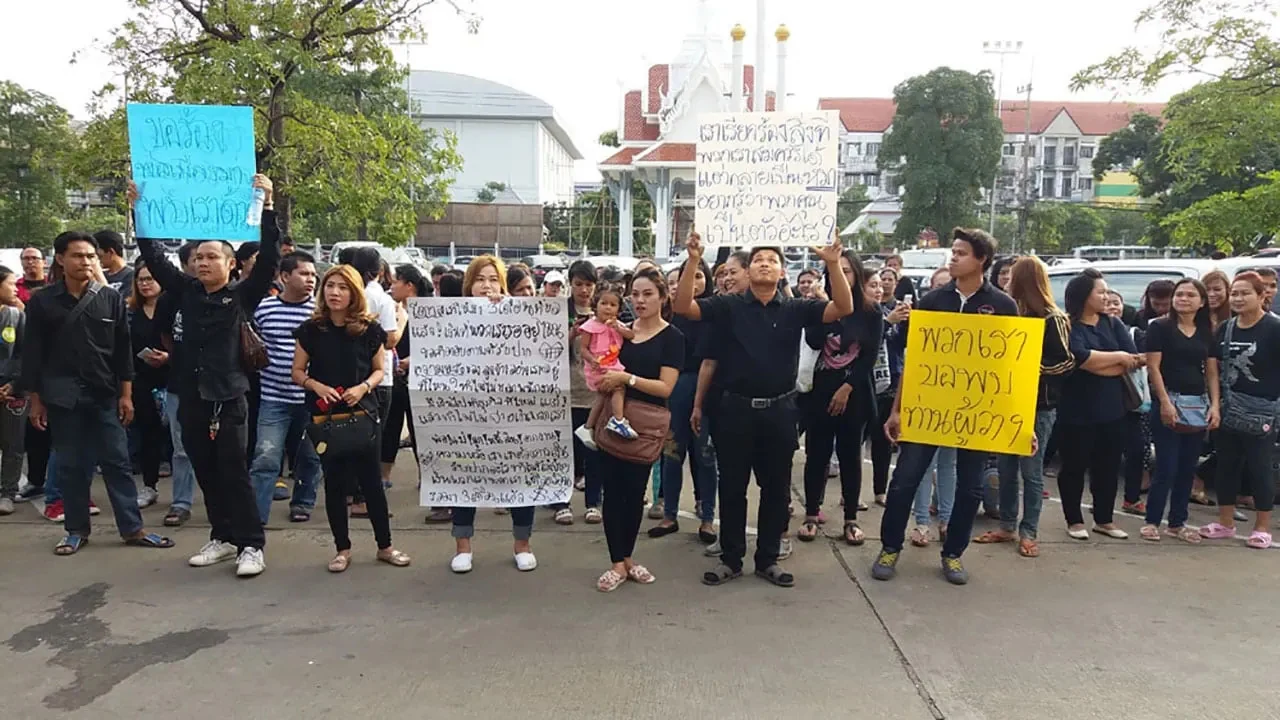 พนักงานที่ถูกเลิกจ้างโดยบริษัทแห่งหนึ่งในสมุทรสาคร รวมตัวเรียกร้องให้นายจ้างจ่ายค่าชดเชยที่ติดค้างมานาน (ที่มาภาพ: ไทยรัฐออนไลน์ (2016))