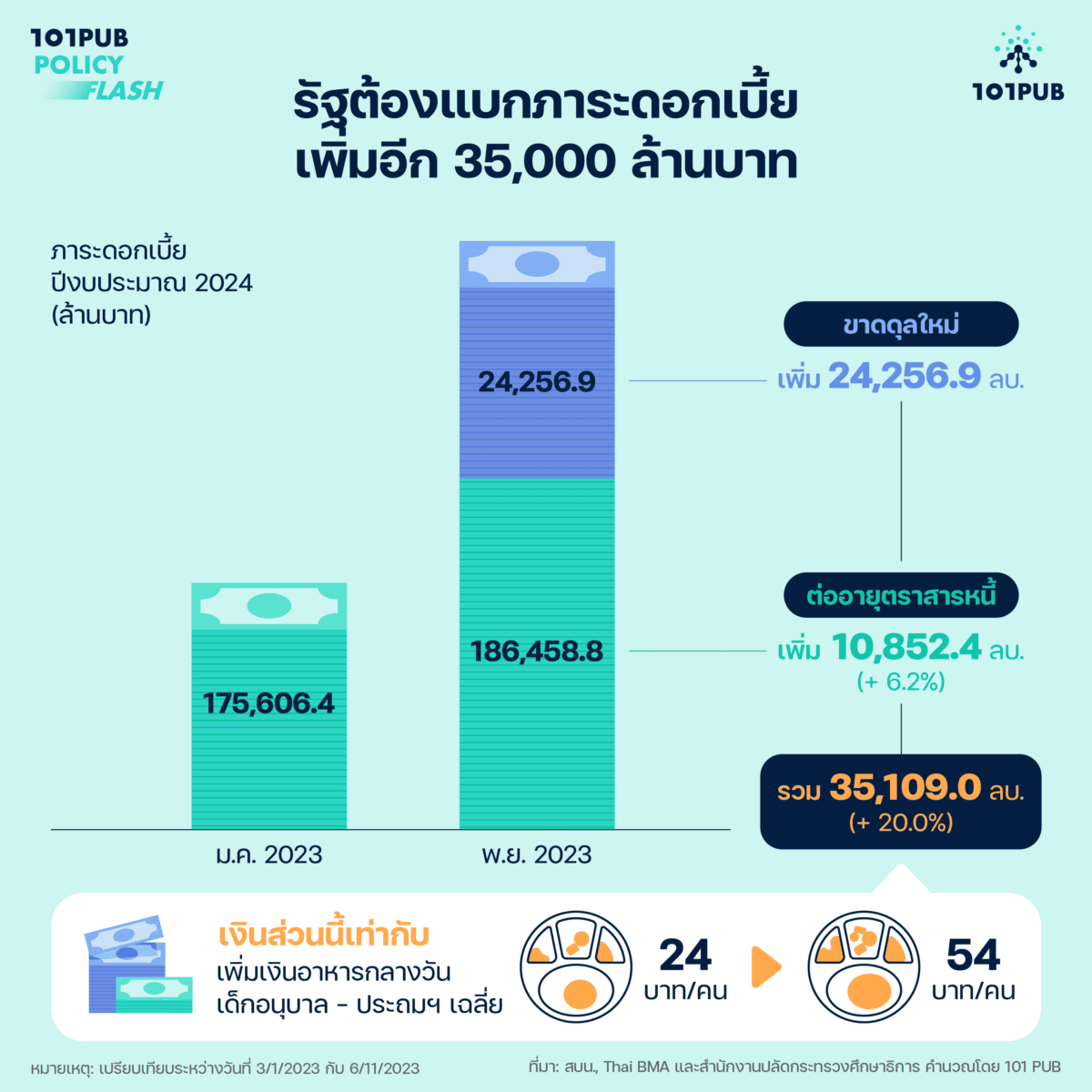 101 PUB – Public Policy Think Tank ชวนผู้อ่านหาตอบว่าภาระต้นทุนการคลังจะเพิ่มขึ้นเท่าไหร่จากการเข้าสู่ยุคดอกเบี้ยแพง จะนำไปสู่แนวโน้มการขาดดุลการคลังที่เพิ่มขึ้นหรือไม่ และมีนัยต่อนโยบายการคลังในอนาคตอย่างไร