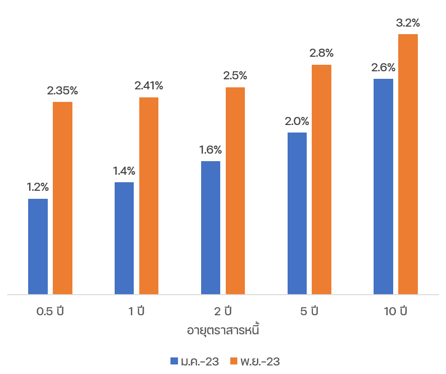 ตามกลไกตลาด หลังจากดอกเบี้ยนโยบายของไทยเพิ่ม ดอกเบี้ยของตราสารหนี้จะต้องเพิ่มตามไปด้วย ซึ่งตั๋วเงินคลังและพันธบัตรรัฐบาลที่เป็นเสมือนสัญญากู้เงินที่รัฐเป็นลูกหนี้ก็ถูกกระทบไปด้วยเช่นกัน ตั้งแต่ต้นปีจนถึงปัจจุบัน (มกราคม 2023 เทียบกับพฤศจิกายน 2023) ดอกเบี้ยตั๋วเงินคลังอายุ 0.5 ปี เพิ่มขึ้นจาก 1.2% เป็น 2.35% ต่อปี, ดอกเบี้ยพันธบัตรอายุ 1 ปี เพิ่มขึ้นจาก 1.4% เป็น 2.41% ต่อปี, ดอกเบี้ยพันธบัตรอายุ 2 ปี เพิ่มขึ้นจาก 1.6% เป็น 2.5% ต่อปี, ดอกเบี้ยพันธบัตรอายุ 5 ปี เพิ่มขึ้นจาก 2.0% เป็น 2.8% ต่อปี, และดอกเบี้ยพันธบัตรอายุ 10 ปี เพิ่มขึ้นจาก 2.6% เป็น 3.2% ต่อปี สังเกตว่าตราสารหนี้ที่มีอายุสั้นได้รับผลกระทบจากช่วงดอกเบี้ยขาขึ้นมากที่สุด (ภาพที่ 1)