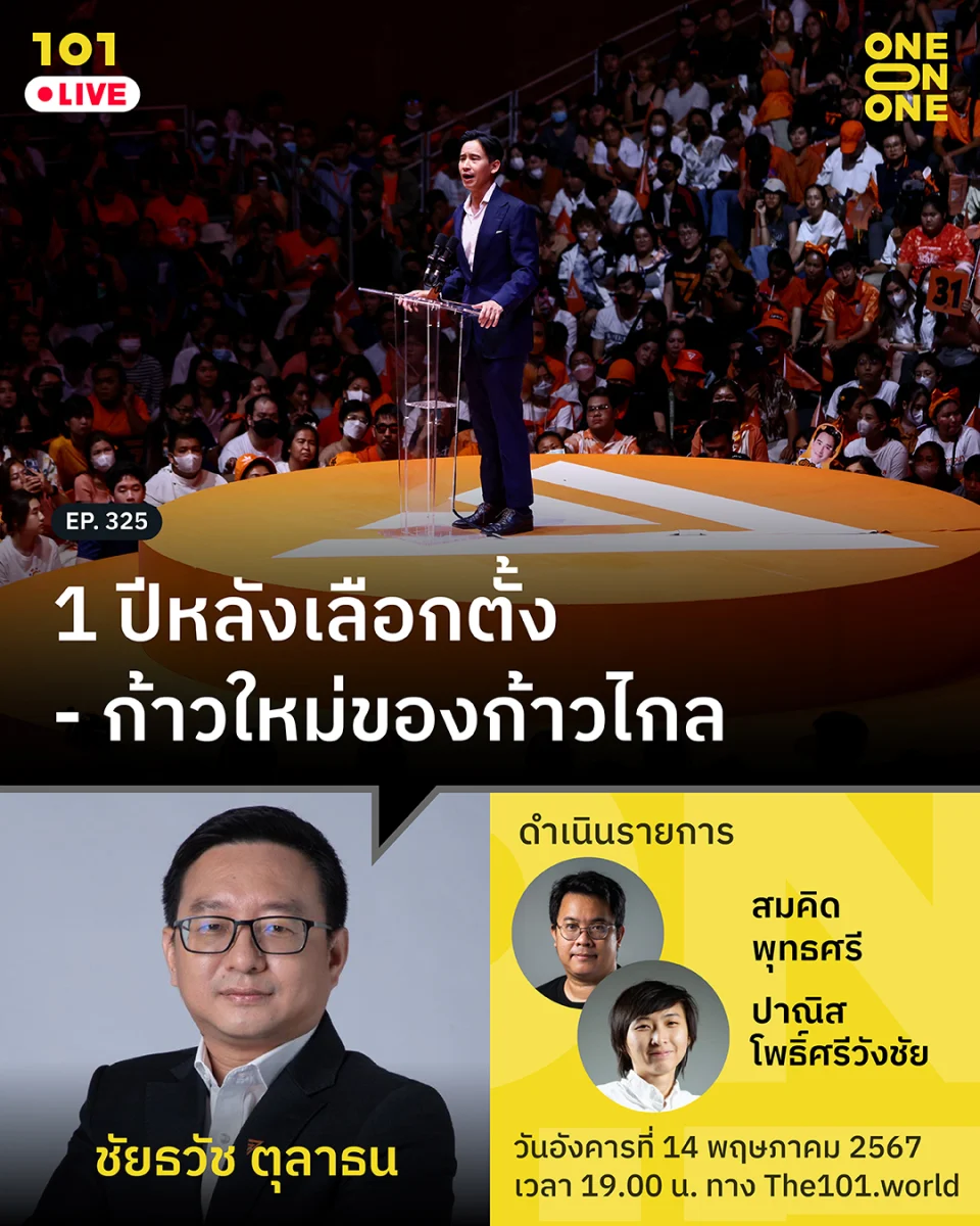 101 ชวน ‘ชัยธวัช ตุลาธน’ หัวหน้าพรรคก้าวไกล และผู้นำฝ่ายค้าน สนทนาในวาระครบรอบ 1 ปีหลังเลือกตั้ง – ก้าวไกลถอดบทเรียนหนึ่งปีที่ผ่านมาอย่างไร อะไรคือสิ่งที่ทำผิด เรื่องไหนคือสิ่งที่ทำพลาด และก้าวใหม่ของพรรคก้าวไกลจะเป็นอย่างไร