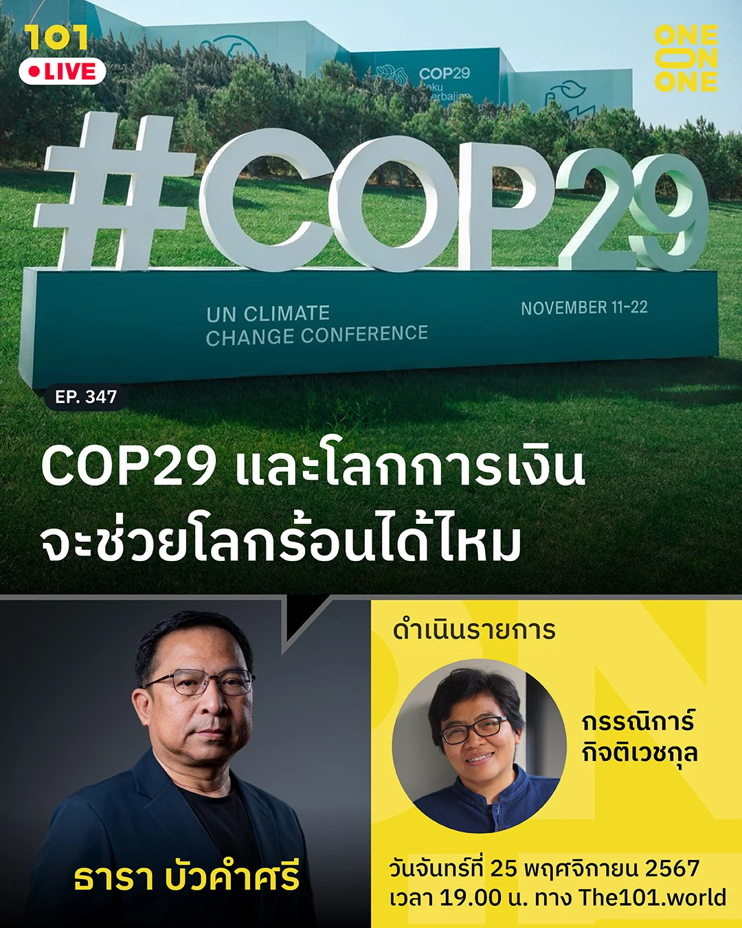 101 ชวนคุยกับ ธารา บัวคำศรี ผู้อำนวยการกรีนพีซ ประเทศไทย เกาะขอบสนามการประชุม COP29 หรือ การประชุมรัฐภาคีกรอบอนุสัญญาสหประชาชาติว่าด้วยการเปลี่ยนแปลงสภาพภูมิอากาศ สมัยที่ 29 ณ กรุงบากู สาธารณรัฐอาเซอร์ไบจาน เปิดจินตนาการถึงทางออกที่เป็นไปได้ของปัญหาโลกร้อน ข้อคิดเกี่ยวกับการผลักดันพลังงานทางเลือก มุมองที่มีต่อพลังงานฟอสซิล ภาคส่วนต่างๆ จะช่วยกันลงขันกันเท่าไร เพื่อแก้วิกฤตโลกร้อนที่ทั่วโลกเผชิญร่วมกัน
