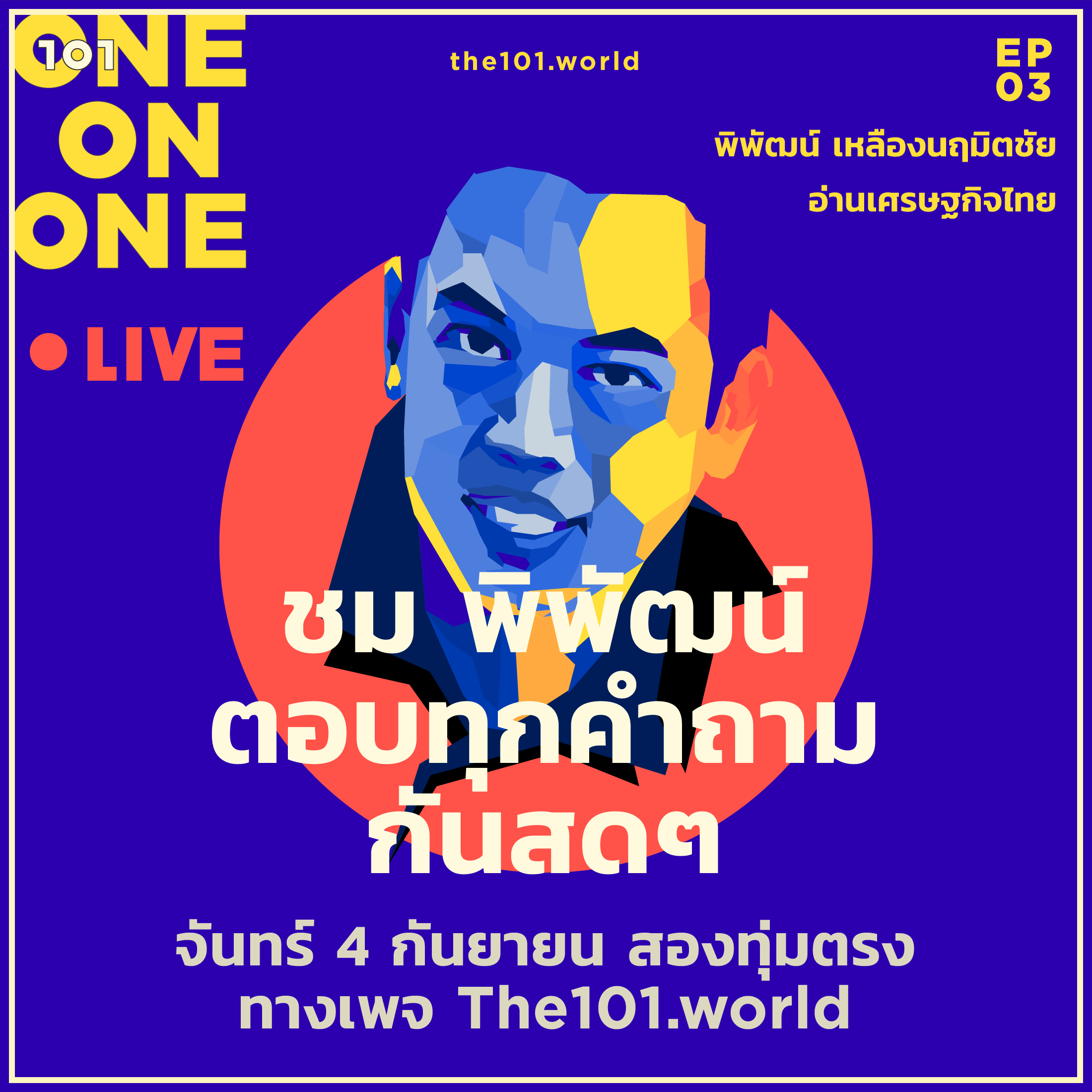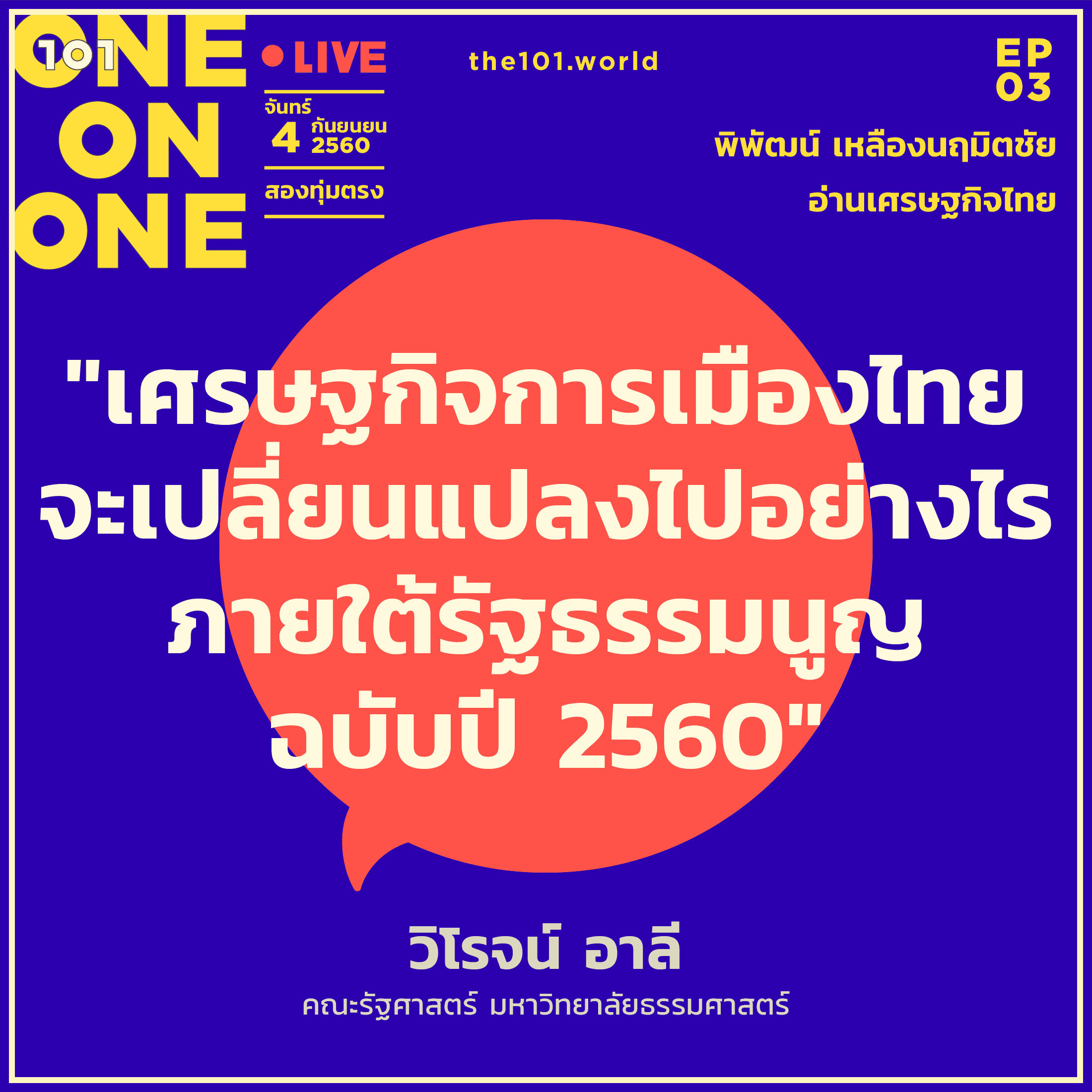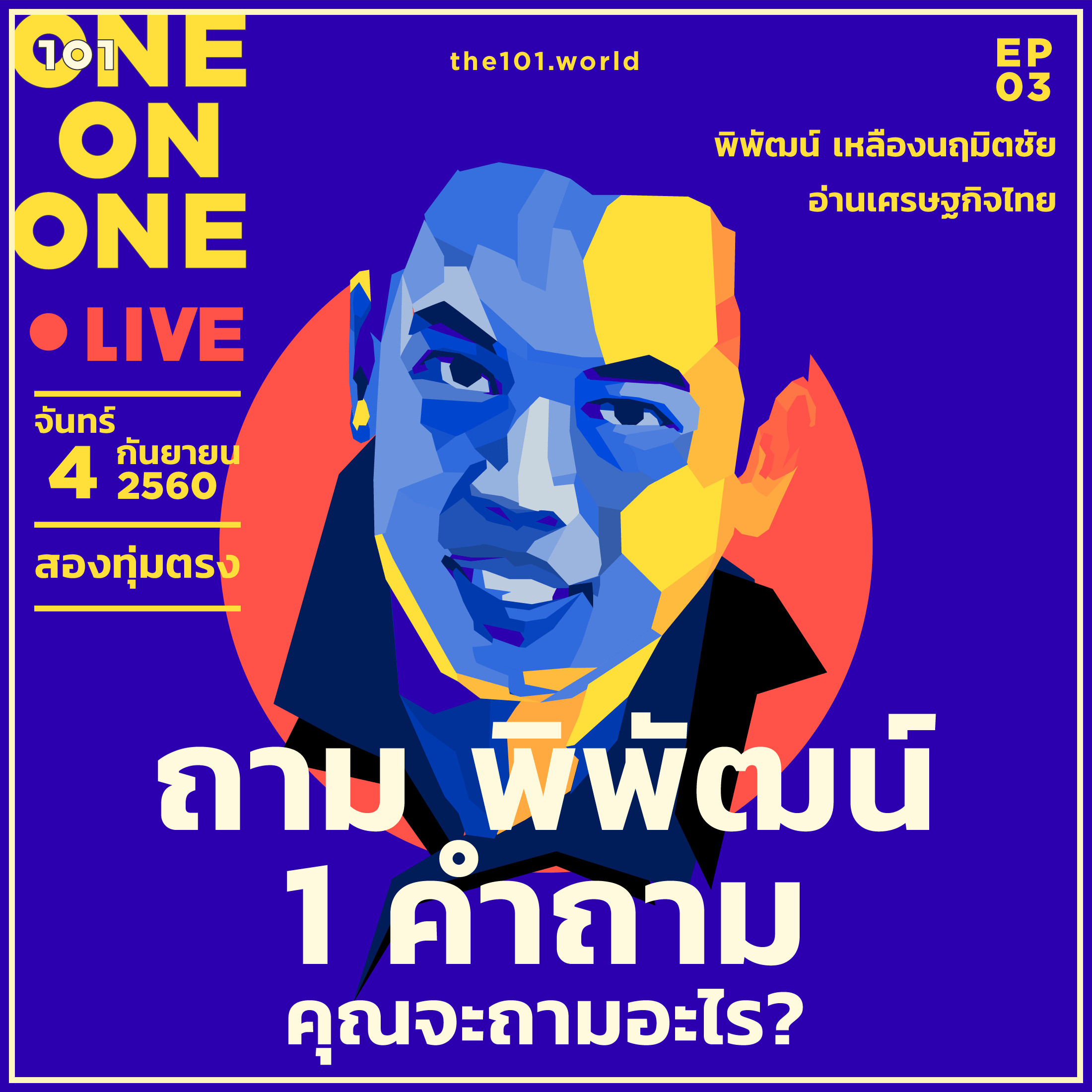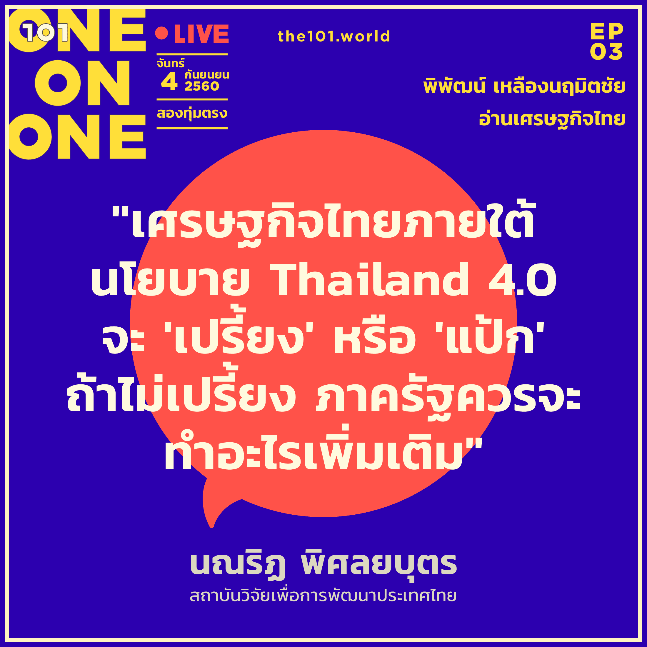 เชิญคุณผู้อ่านและคุณผู้ชม 101 ร่วมชวนคุย ร่วมตั้งคำถาม ร่วมหาคำตอบ ร่วมแลกเปลี่ยนความคิด และร่วมอ่าน “เศรษฐกิจไทย” กับพิพัฒน์ เหลืองนฤมิตชัย แบบสดๆ คืนวันจันทร์ที่ 4 ก.ย. เวลาสองทุ่ม