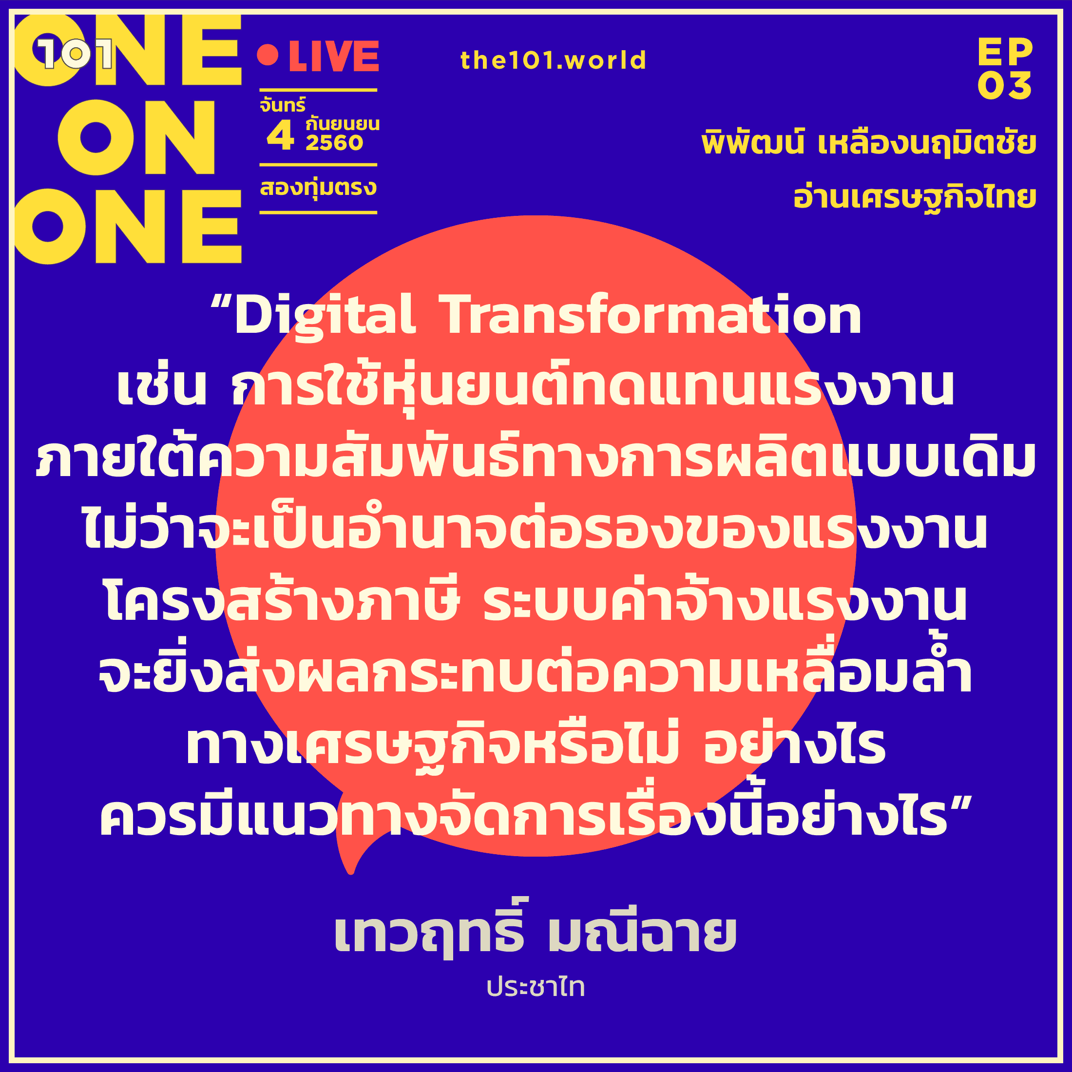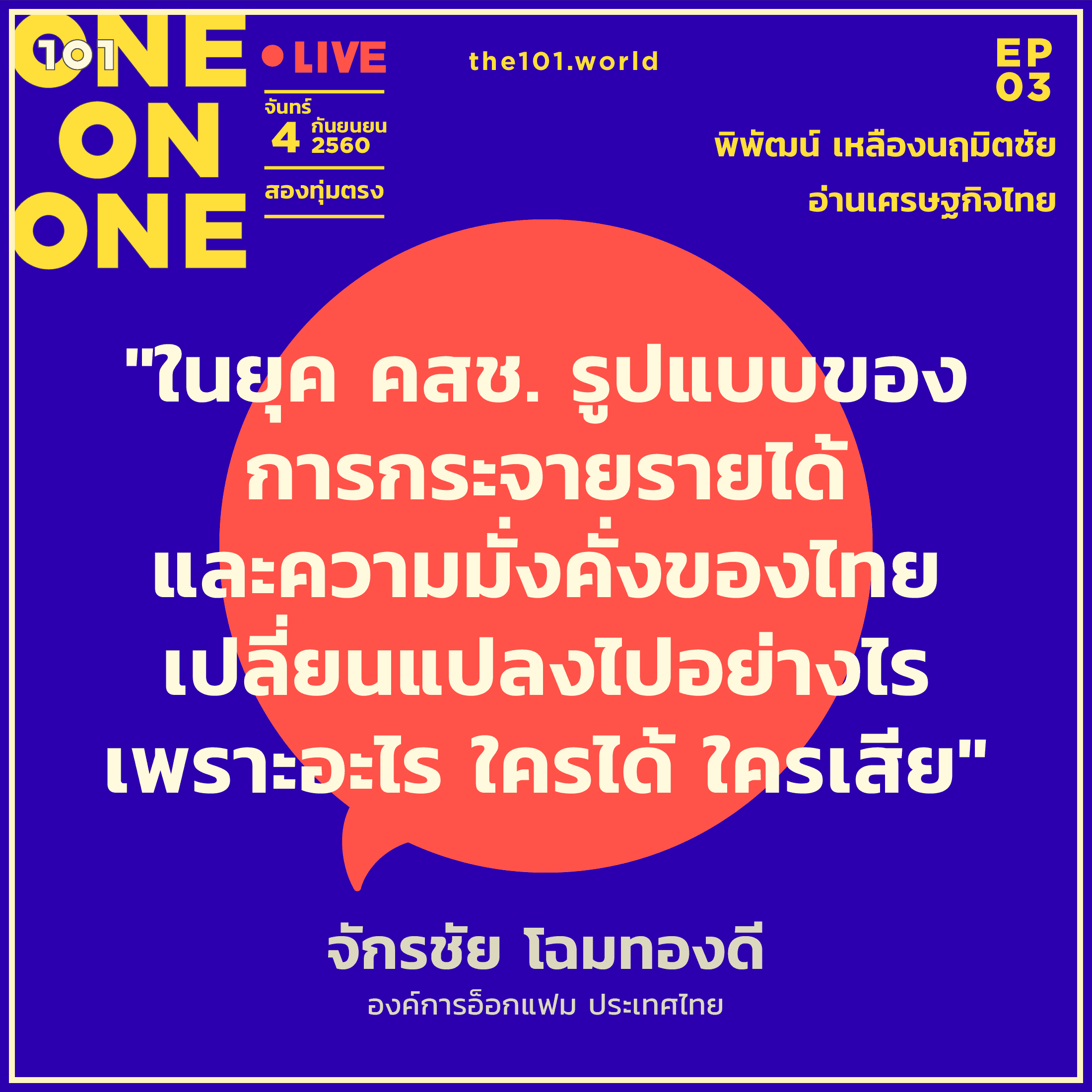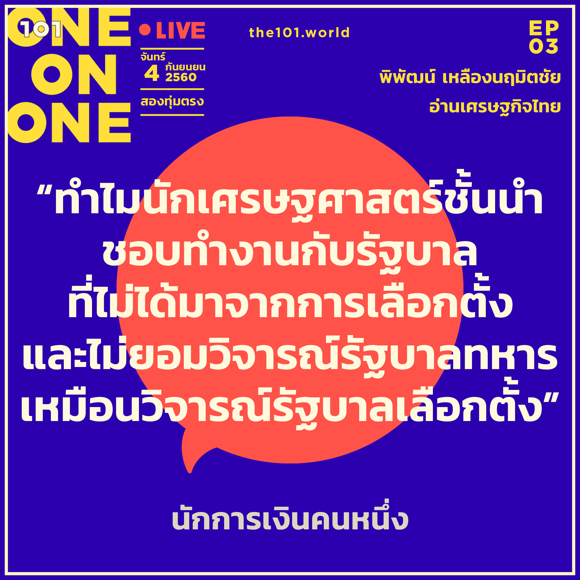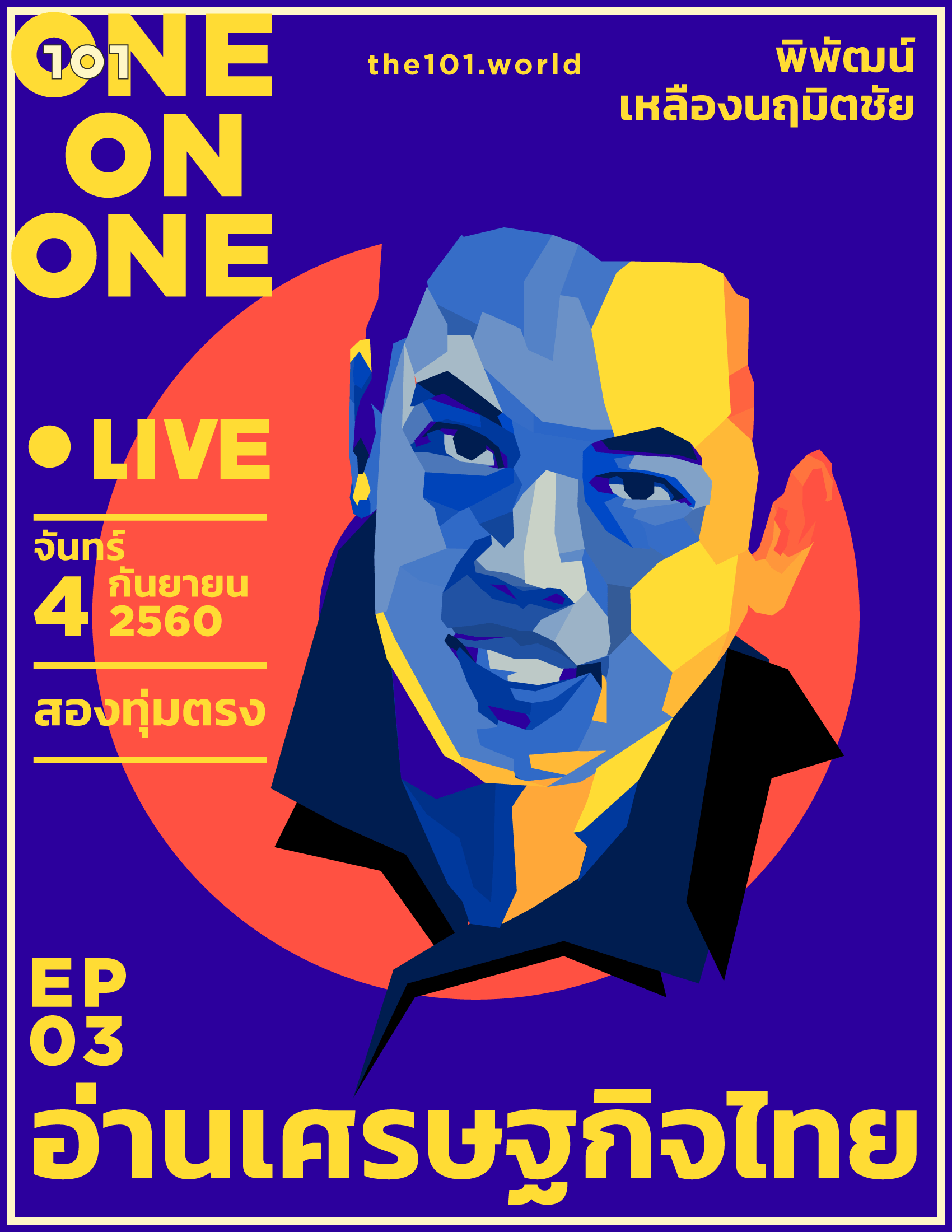 เชิญคุณผู้อ่านและคุณผู้ชม 101 ร่วมชวนคุย ร่วมตั้งคำถาม ร่วมหาคำตอบ ร่วมแลกเปลี่ยนความคิด และร่วมอ่าน “เศรษฐกิจไทย” กับพิพัฒน์ เหลืองนฤมิตชัย แบบสดๆ คืนวันจันทร์ที่ 4 ก.ย. เวลาสองทุ่ม