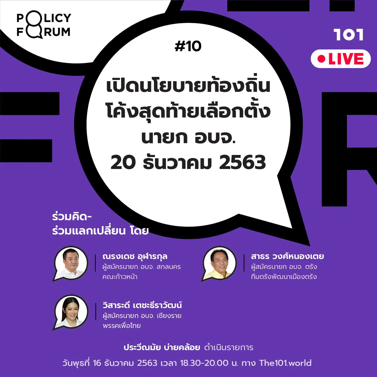 ::LIVE:: 101 Policy Forum #10 : เปิดนโยบายท้องถิ่น โค้งสุดท้ายเลือกตั้งนายก อบจ. 20 ธันวาคม 2563