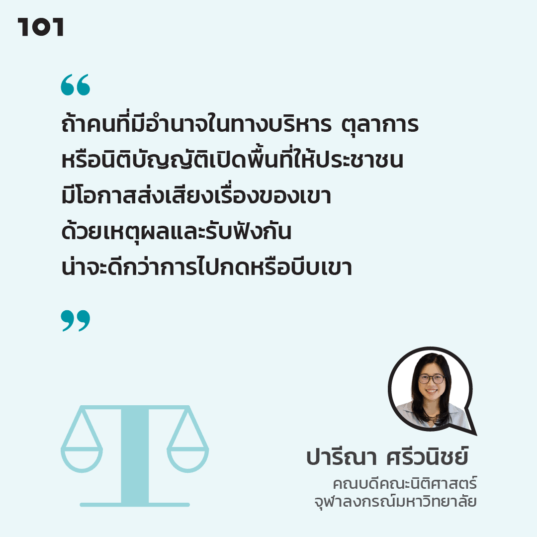 101 หยิบบางส่วนจากการพูดคุยมาชวนสังคมให้คิดต่อไปถึงการทำให้กระบวนการยุติธรรมสามารถเป็นที่พึ่งให้ประชาชนได้ ในช่วงเวลาที่การทำหน้าที่ของสถาบันต่างๆ ในกระบวนการยุติธรรมถูกวิพากษ์วิจารณ์ โดยเฉพาะส่วนที่เกี่ยวข้องกับสิทธิในกระบวนการยุติธรรมของประชาชน เช่น สิทธิในการประกันตัวเพื่อสู้คดีอย่างเต็มที่และเป็นธรรม