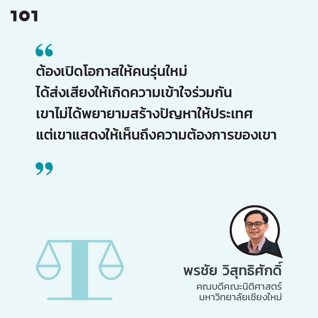 เราต้องเปิดโอกาสให้คนรุ่นใหม่ได้แสดงความเห็น ได้ส่งเสียงของเขาให้เกิดความเข้าใจร่วมกัน เขาไม่ได้พยายามสร้างปัญหาให้ประเทศ แต่เขาแสดงให้เห็นถึงความต้องการของเขา ถ้าเราคิดได้ว่าตอนเราเป็นวัยรุ่นเราก็คล้ายเขานั่นแหละ อยากฝากให้คิดว่าตอนวัยรุ่นเราคงไม่ต่างกัน เพราะฉะนั้นต้องฟังและทำความเข้าใจเขา เพื่อให้เขาเป็นผู้ใหญ่และเป็นคนที่สร้างสังคมใหม่ให้เราให้ได้