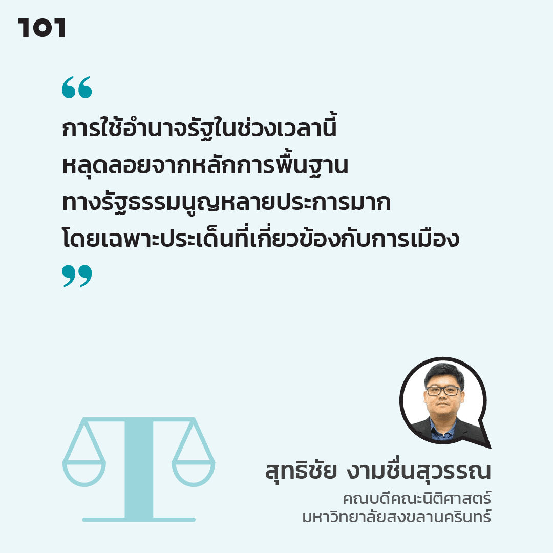 ถ้าพูดในฐานะคนสอนกฎหมายมหาชน การใช้อำนาจรัฐในช่วงเวลานี้ หลุดลอยจากหลักการพื้นฐานทางรัฐธรรมนูญหลายประการมาก โดยเฉพาะประเด็นที่เกี่ยวข้องกับการเมืองแล้วทุกระบบกฎหมายก็ยอมรับหลักการพื้นฐานเหล่านี้ ไม่ว่าจะเป็นหลักสันนิษฐานไว้ก่อนว่าเป็นผู้บริสุทธิ์ หลักการห้ามเลือกปฏิบัติ สิทธิในการพบทนาย สิทธิในการแจ้งให้ญาติทราบว่าถูกควบคุมตัว นี่คือหลักการพื้นฐานที่ระบบกฎหมายยอมรับทุกระบบ และไม่ได้เป็นข้อถกเถียงอะไรเลย แต่ว่าเป็นประเด็นที่เรายังต้องมาพูดกันอยู่วันนี้
