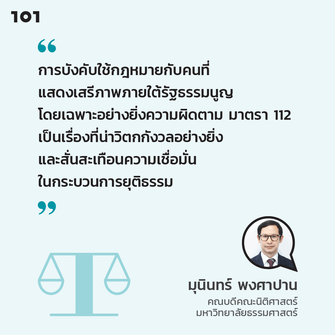 การบังคับใช้กฎหมายกับคนที่แสดงเสรีภาพภายใต้รัฐธรรมนูญแล้วถูกกล่าวหาว่ากระทำความผิด โดยเฉพาะอย่างยิ่งความผิดตามประมวลกฎหมายอาญา มาตรา 112 เป็นเรื่องที่น่าวิตกกังวลอย่างยิ่ง และสร้างความสั่นสะเทือนต่อความเชื่อมั่นในกระบวนการยุติธรรมภาพรวมทั้งหมด