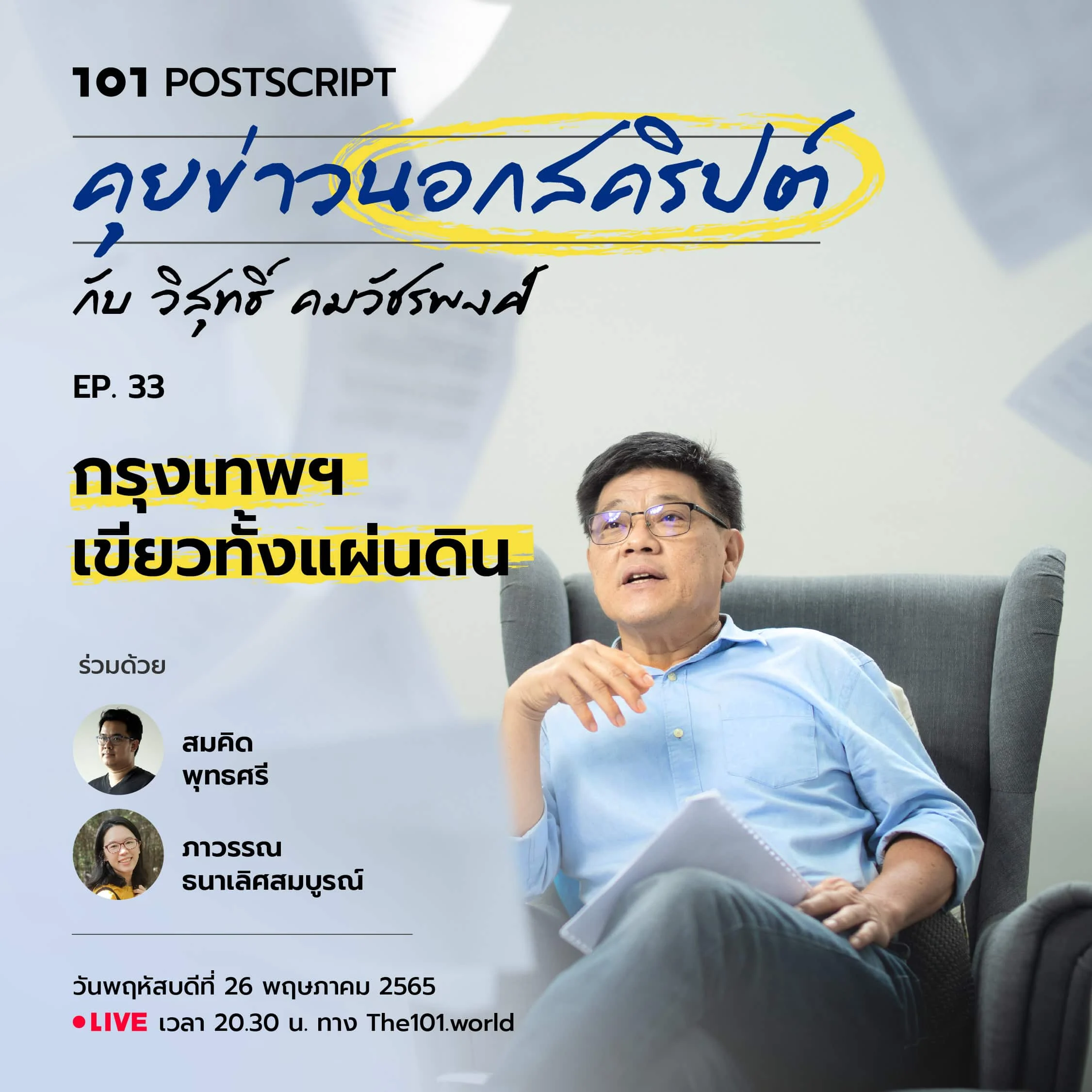 วันพฤหัสบดีที่ 26 พฤษภาคม 2565 เวลา 20.30 น. ติดตามรายการได้พร้อมกันทุกแพลตฟอร์มของ The101.world