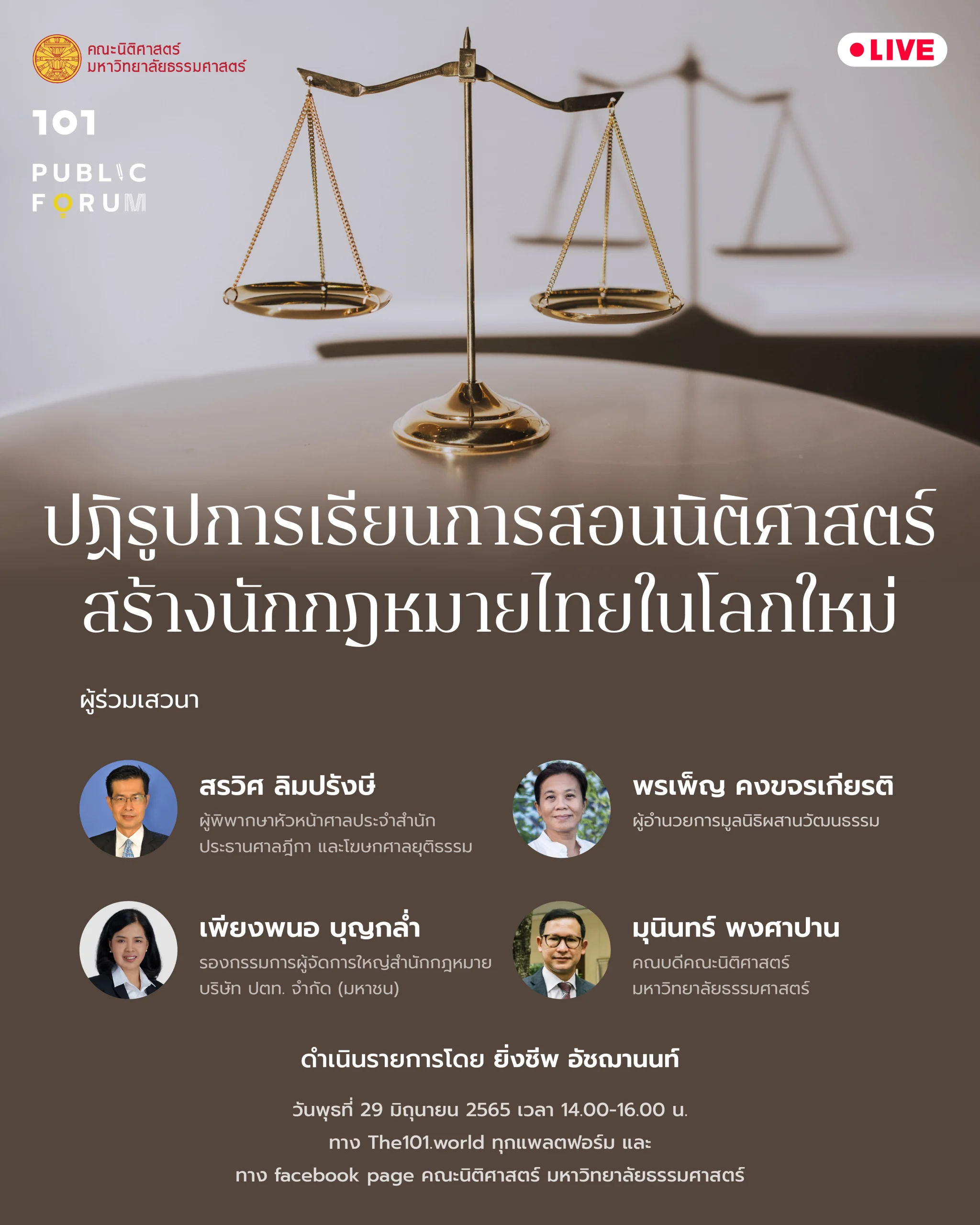 วันพุธที่ 29 มิถุนายน 2565 เวลา 14.00-16.00 น. ทาง The101.world ทุกแพลตฟอร์ม และทาง Facebook page คณะนิติศาสตร์ มหาวิทยาลัยธรรมศาสตร์