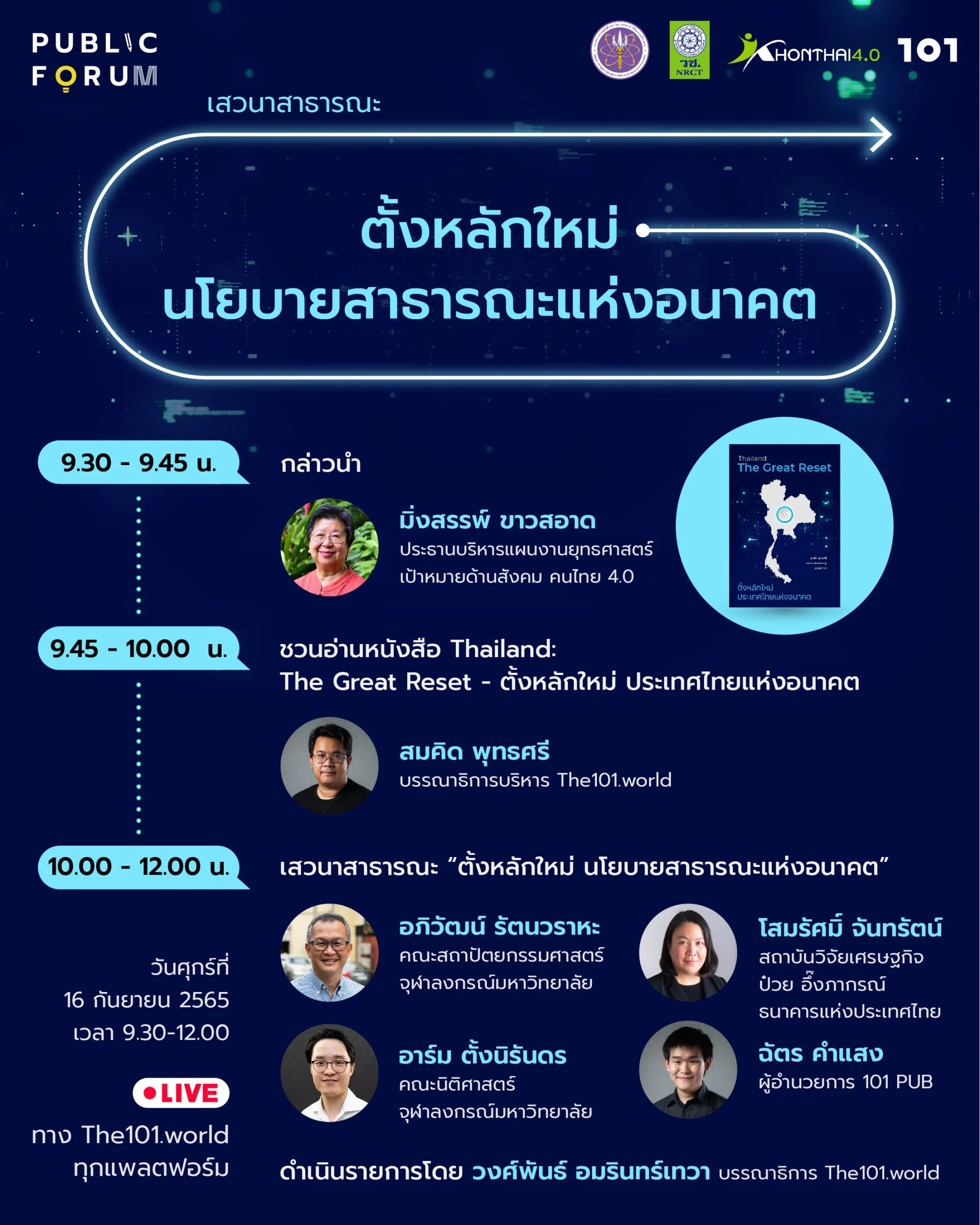 101 ร่วมกับ ‘แผนงานบูรณาการยุทธศาสตร์เป้าหมาย (Spearhead) ด้านสังคม คนไทย 4.0 ชวนคุณมาร่วม ‘ตั้งหลักใหม่ประเทศไทย’ พร้อมเปิดตัวหนังสือ ‘Thailand: The Great Reset – ตั้งหลักใหม่ ประเทศไทยแห่งอนาคต’ ซึ่งรวบรวมบทสัมภาษณ์นักคิดหลากวงการ หลายรุ่น กว่า 30 ชีวิตในโจทย์ใหญ่ของประเทศ พร้อมกับร่วมหาคำตอบว่า นโยบายสาธารณะแบบไหนที่จะพาไทยออกจากวิกฤต