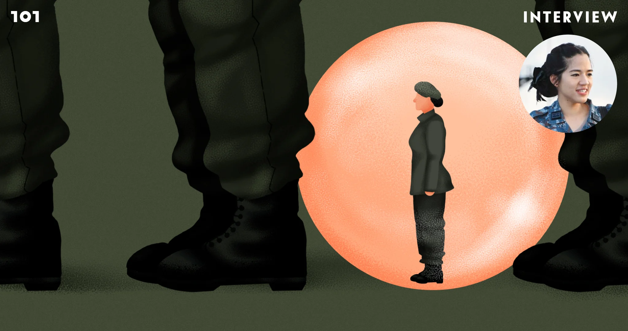 ภาพประกอบชิ้นนี้เล่าเรื่องผ่านภาพของทหารหญิงที่ถูกย่อขนาดลง เปรียบเสมือนบทบาทและสถานะของผู้หญิงในกองทัพ ซึ่งมักถูกมองว่าเป็นเพียงส่วนเสริม ในขณะที่ทหารชายถูกยกให้เป็นตัวเอกหลักของเรื่องราว
