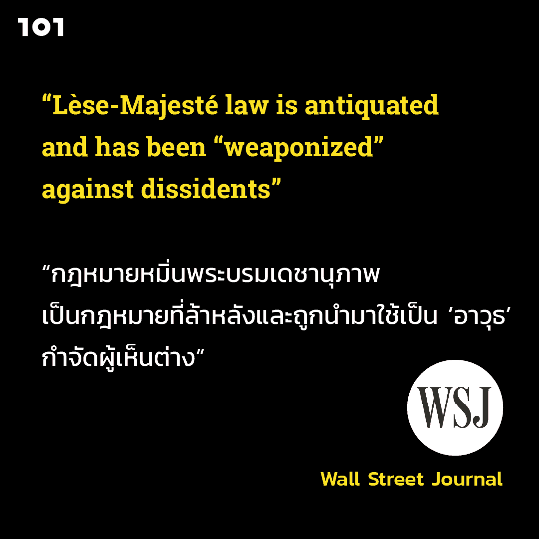 ข้อความดังกล่าวคือส่วนหนึ่งจากเนื้อความในข่าว “Thailand Uses Controversial Lèse-Majesté Law Against Pro-Democracy Protesters” โดย Feliz Solomon ผู้สื่อข่าวเอเชียตะวันออกเฉียงใต้ ปรากฏในเว็บไซต์สำนักข่าว Wall Street Journal ตีพิมพ์ ณ วันที่ 30 พฤศจิกายน 2020