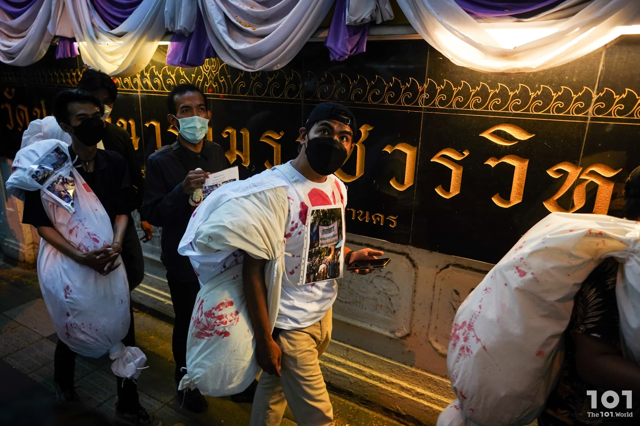 เวลาประมาณ 17.30 น. มีการเดินขบวนแบกศพจำลอง 6 ศพจากวัดปทุมวนารามพร้อมตะโกนว่าที่นี่มีคนตายจนถึงแยกราชประสงค์ หลังจากนั้นมีการแสดงออกเชิงสัญลักษณ์โดยให้คนเสื้อแดงนอนบนพื้นริมฟุตบาทหน้าป้ายราชประสงค์ แขวนกระดาษรูปคนพร้อมเขียนชื่อผู้เสียชีวิตจากการสลายการชุมนุมบนริบบิ้นสีแดง รวมไปถึงจุดเทียนรำลึกและร่วมร้องเพลงนักสู้ธุลีดิน