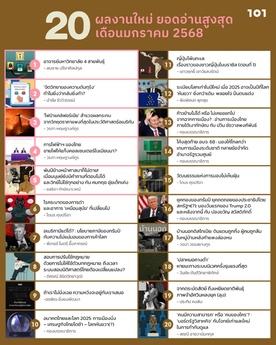 เปิดปี 2025 กับการกลับมาของโดนัลด์ ทรัมป์ในตำแหน่งประธานาธิบดีสหรัฐฯ สมัยที่สอง สะท้อนบรรยากาศการเมืองโลก ที่การต่อสู้เพื่อสิทธิมนุษยชนและความเท่าเทียม ต้องพ่ายแพ้ต่อแนวทางปฏิบัตินิยมที่เน้นเรื่องเศรษฐกิจปากท้อง บรรยากาศที่ผู้คนดิ้นรนเอาตัวรอดในระดับปัจเจก ก็ทำให้รู้สึกท้อแท้และหมดพลังไปในคราวเดียวกัน แต่สถานการณ์แบบนี้ เรายิ่งต้องไม่ท้อแท้นิ่งเฉย แต่ต้องร่วมกันเติมความหวังผ่านการสร้างสังคมความรู้และฉันทมติใหม่