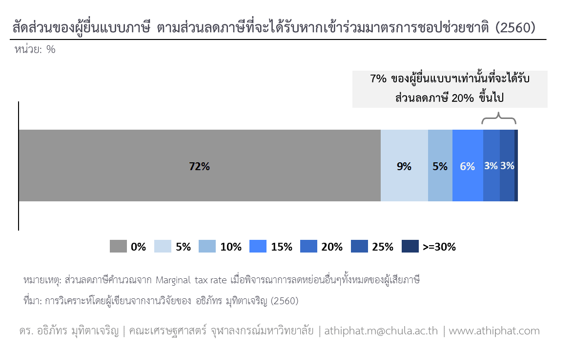 ในงานวิจัยของผมที่ได้รับความกรุณาจากกรมสรรพากรให้ใช้ข้อมูลผู้เสียภาษีในการศึกษา พบว่า มีเพียงแค่ประมาณ 7% ของผู้ยื่นแบบภาษีเท่านั้นที่เข้าข่ายจะได้รับส่วนลดภาษี 20% ขึ้นไปจากมาตรการช็อปช่วยชาติ  ดังนั้นก่อนจะออกไปซื้อของ ผมขอให้ท่านผู้อ่านลองกดเครื่องคิดเลขคำนวณเงินได้สุทธิ และส่วนลดภาษีที่แท้จริงของเราก่อน อย่าเพิ่งรีบใช้สิทธิโดยที่ตัวเองยังไม่รู้ว่าจะได้ส่วนลดเท่าไหร่