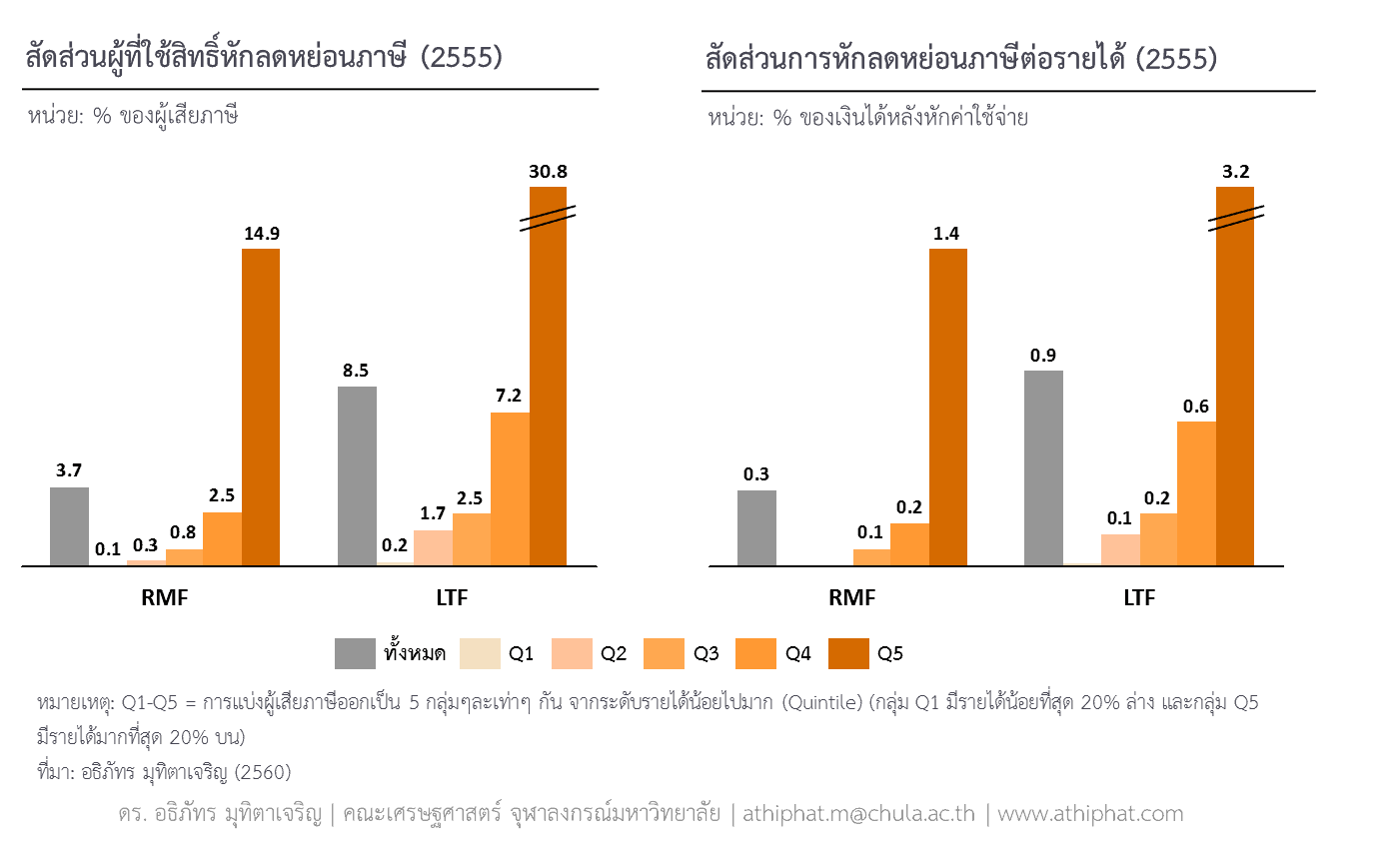 นอกจากนี้ สิ่งสำคัญที่สุดถ้าท่านมีเงินเหลือและยังไม่รู้ว่าจะซื้ออะไรดี แต่อยากได้ส่วนลดภาษี การเอาเงินนั้นไปออมหรือลงทุน เช่น ซื้อหน่วยลงทุนพวก RMF และ LTF น่าจะเป็นทางเลือกที่ดีกว่าครับ โดยรวมสัดส่วนของผู้เสียภาษีไทยที่ได้ลดหย่อนภาษีผ่าน RMF หรือ LTF มีเพียงแค่ไม่ถึง 10% เท่านั้น และเมื่อพิจารณาเฉพาะกลุ่มผู้มีรายได้ปานกลาง สัดส่วนนี้ยิ่งน้อยลงไปอีกอยู่ในระดับต่ำกว่า 5% นอกจากนี้สัดส่วนของการหักลดหย่อนต่อรายได้ของหน่วยลงทุนทั้ง 2 ประเภทนี้ก็ยังถือว่าค่อนข้างต่ำทีเดียว โดยเฉพาะอย่างยิ่งในกลุ่มคนรายได้ปลายกลาง