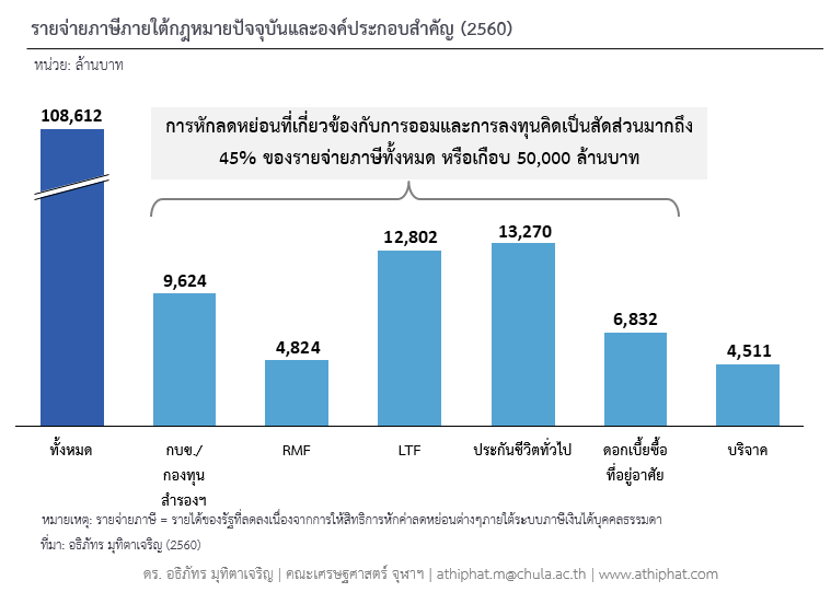 งานวิจัยของผมได้ประมาณการว่า รายได้ของรัฐที่ลดลงเนื่องจากการให้สิทธิการลดหย่อนต่างๆในระบบภาษีเงินได้บุคคลธรรมดา มีมูลค่ามากถึง 1 ใน 3 ของรายได้จากภาษีเงินได้บุคคลธรรมดาทั้งหมดในปี 2560 นอกจากนี้ ต้นทุนของการลดหย่อนภาษีส่วนใหญ่ยังจะกระจุกตัวอยู่ที่คนรวย โดย 27% ของเม็ดเงินต้นทุนการลดหย่อนภาษีนี้ จะเป็นของผู้ที่มีรายได้สูงสุด Top 5%