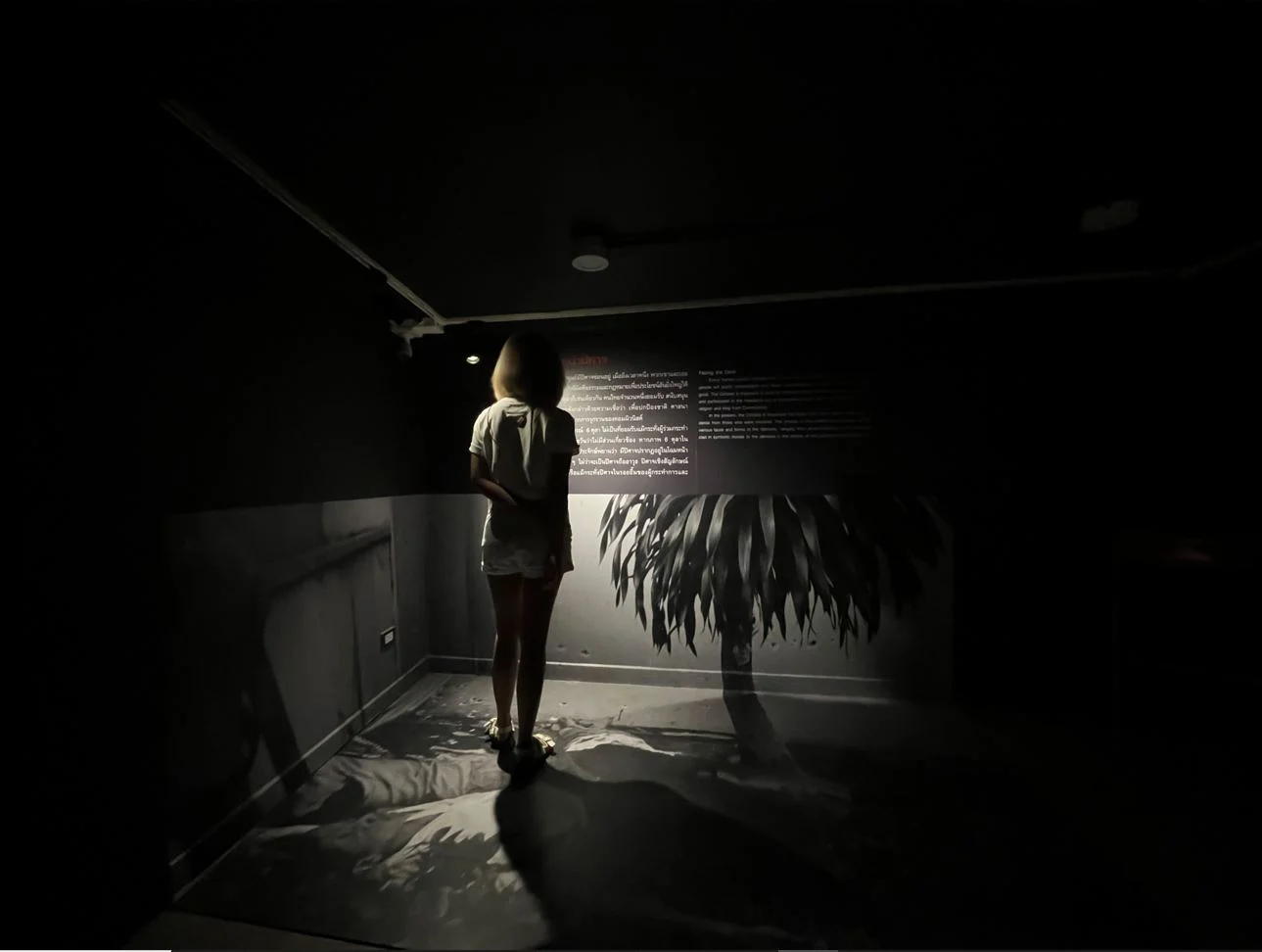 บททดสอบต่อมาอยู่ถัดขึ้นไปบนชั้นลอย หลังจากก้าวขึ้นบันไดที่มีข้อความเล่าเหตุการณ์ทางประวัติศาสตร์สั้นๆ ไปตามลำดับเวลาอย่าง ‘มิถุนายน 2475 คณะราษฎรล้มสมบูรณาญาสิทธิราชย์’ ‘ตุลาคม 2476 การโต้กลับของฝ่ายเจ้าแต่พ่ายแพ้’ ฯลฯ ภาพที่ปะทะกับสายตาคือภาพของร่างที่นอนอยู่บนพื้น ด้านข้างของร่างหนึ่งนั้นเป็นต้นไม้ที่ลำต้นพาดยาวขึ้นไปจากพื้นสู่ผนัง สร้างความต่อเนื่องของสายตาให้ลากขึ้นไปยังคำบรรยายนิทรรศการ ‘เผชิญหน้าปีศาจ’ บนผนัง หากทว่า เพื่อที่จะอ่านคำบรรยายนั้น เราอาจต้องกลายร่างเป็นปีศาจเสียเอง เพราะเราจำต้องเดินเหยียบภาพร่างบนพื้นเพื่อก้าวเท้าเข้าไปข้างใน เพื่อที่จะได้เผชิญหน้ากับปีศาจ เราต้องยืนอยู่บน (ภาพ) คนตายให้ได้เสียก่อน