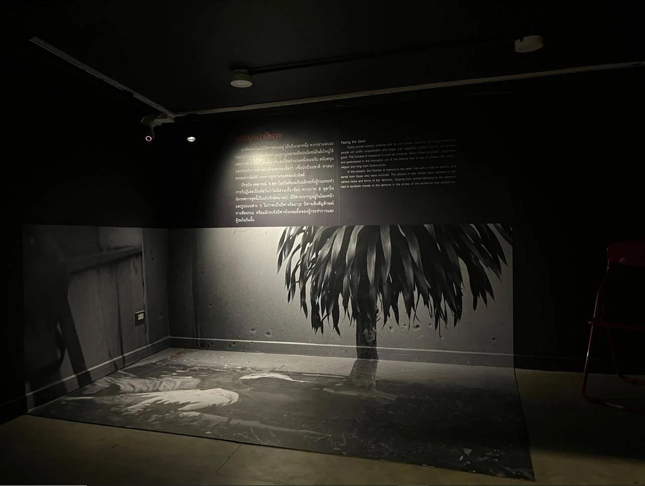 พื้นที่ใน-นอกกระจกสะท้อนกันและกัน เราจึงมองเห็นตัวเองซ้อนอยู่ในภาพถ่าย การติดตั้งเช่นนี้สร้างภาวะจำลองที่โอบรัดให้เราได้เป็นส่วนหนึ่งของเหตุการณ์ ชวนให้ตั้งคำถามเชิงสมมติว่าเราจะเป็นใครหากได้อยู่ในสถานการณ์อันเป็นอดีตนั้น? เราจะเป็นไทยมุง? มวลชนฝ่ายขวา? เจ้าหน้าที่ทางการ? หรือเหยื่อของการรุมประชาทัณฑ์? ทั้งที่ในความเป็นจริงแล้ว เราเป็นใครอื่นไปไม่ได้นอกจากตัวเราเอง ผู้เฝ้ามองจากปัจจุบันอันเป็นอนาคตของอดีตในภาพ ผู้พินิจพิเคราะห์ ‘ปีศาจที่ซ่อนอยู่ในรายละเอียด’