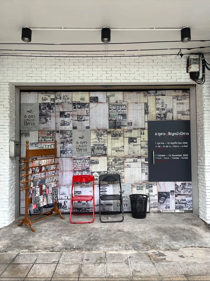 ความสำคัญของสำนักข่าวซึ่งเป็นแหล่งที่มาของภาพถ่ายในนิทรรศการนี้ถูกนำเสนอตั้งแต่ผนังด้านนอกอาคารที่ถูกปิดทับด้วยกระดาษหนังสือพิมพ์จนเต็มพื้นที่ ส่วนวัตถุจัดแสดงแรกที่ต้อนรับผู้ชมนั้นคือ ราวแขวนหนังสือพิมพ์กับเก้าอี้พับสองตัว ‘เก้าอี้พับ’ อันเป็นวัตถุชิ้นสำคัญที่เรามักนึกถึงเมื่อมีบทสนทนาเกี่ยวกับเหตุการณ์ 6 ตุลา (ผลพวงจากภาพ ‘ฟาดเก้าอี้’ อันเป็นภาพไอคอนของเหตุการณ์) ได้เปลี่ยนสถานะจากการเป็นสัญญะแห่งความรุนแรงเพื่อกลับสู่บทบาทดั้งเดิมคือ ‘ที่สำหรับนั่ง’ (อ่านหนังสือพิมพ์)