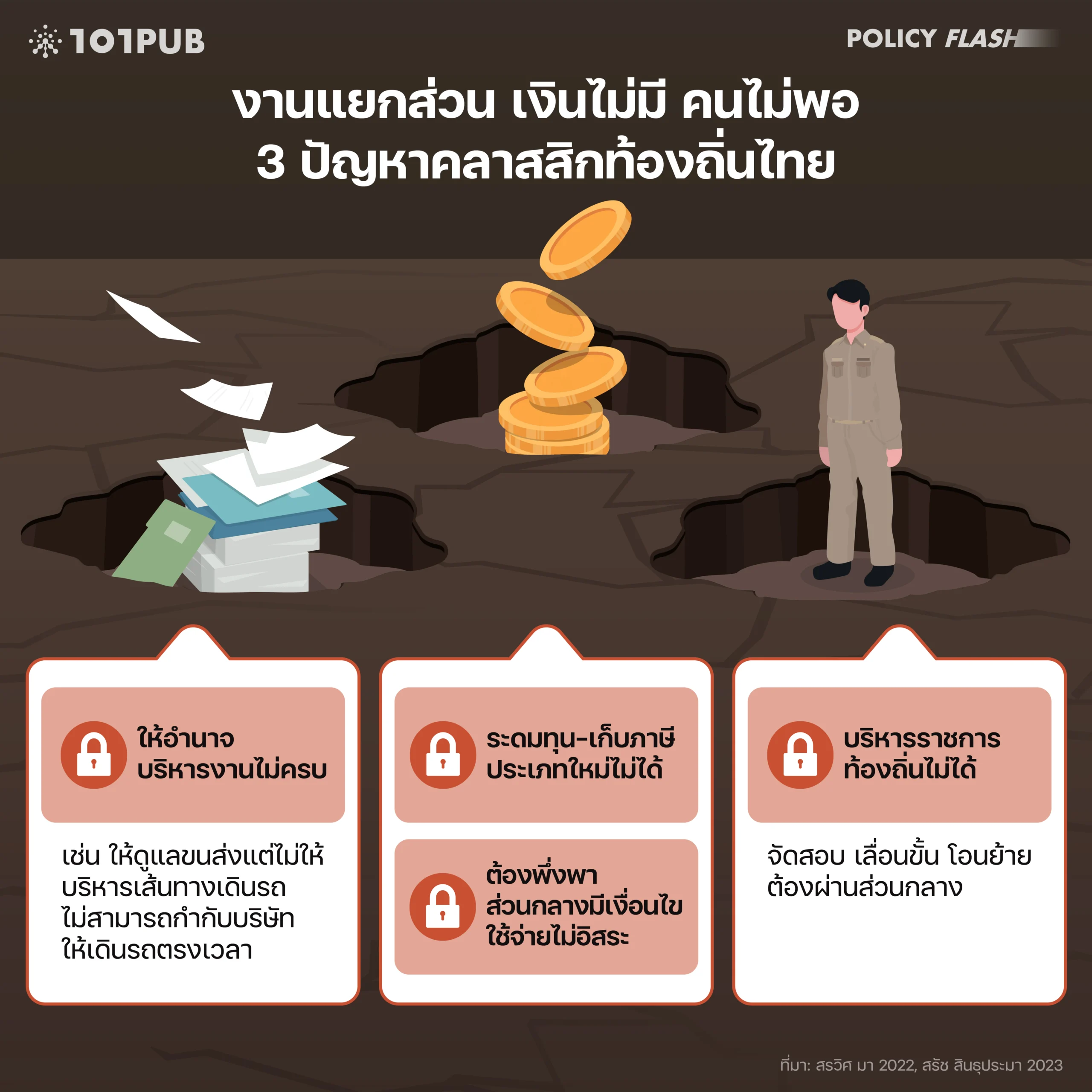 4 สรวิศ มา. 2022. ‘ประเมินสถานะการกระจายอำนาจ: 2 ทศวรรษที่ยังไปไม่ถึงเป้า’. 3 พฤศจิกายน 2022. https://101pub.org/two-decades-decentralization/.