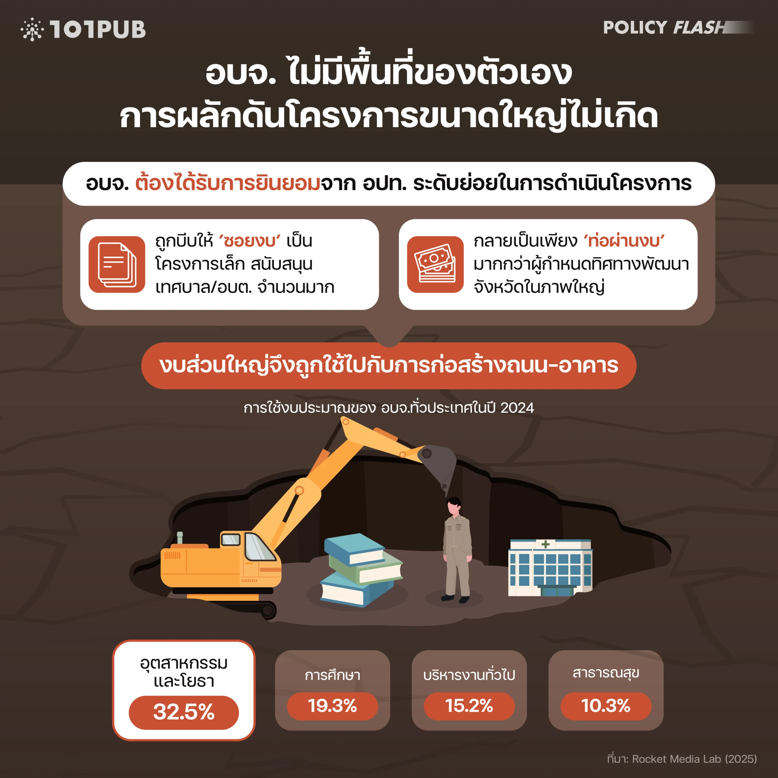 5 Rocket Media Lab. 2025. ‘4 ปี อบจ. 76 จังหวัด ใช้งบค่าก่อสร้างสิ่งสาธารณูปโภคในการทำถนน 71.11%’. 20 January 2025. https://rocketmedialab.co/pao-2025-collab-3/.