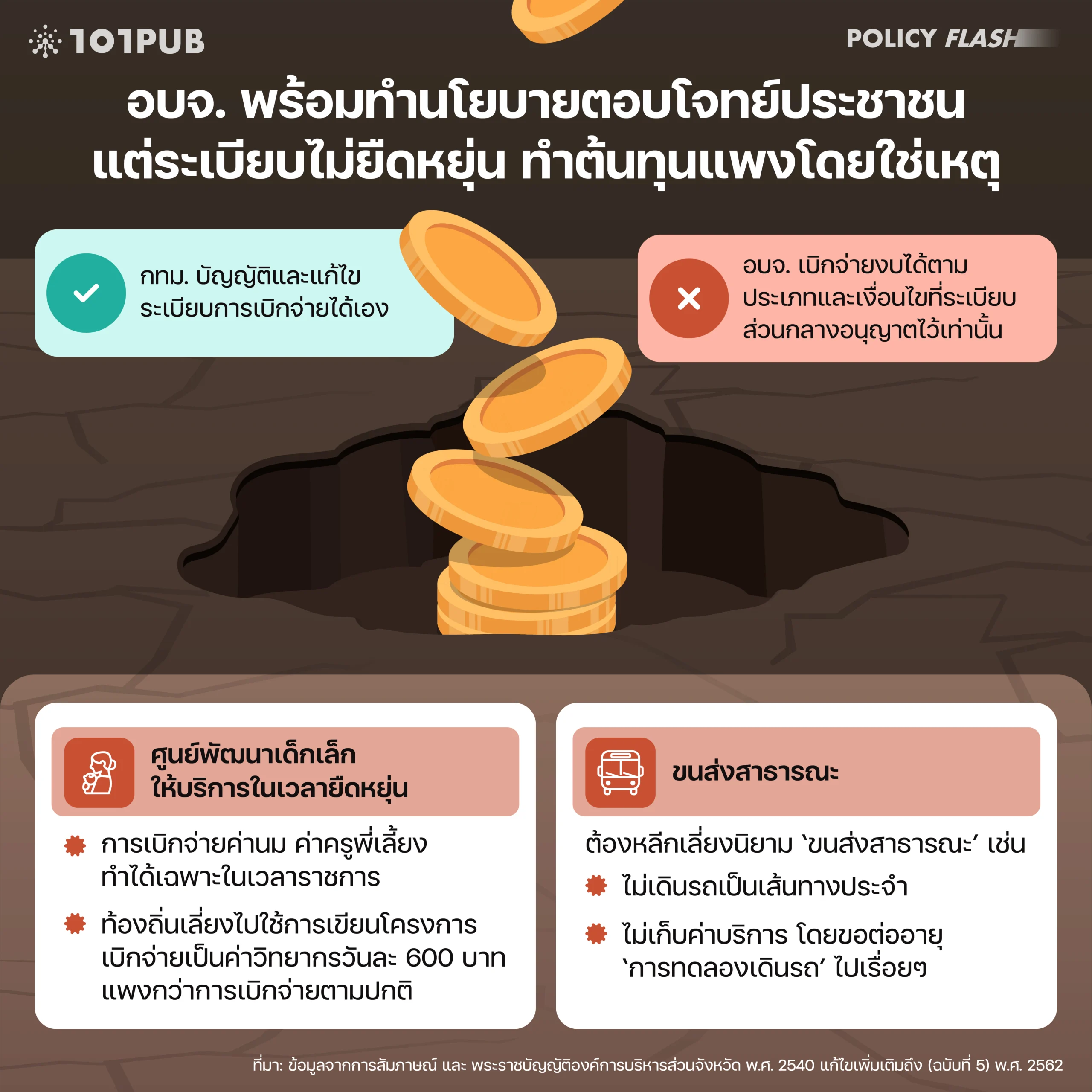 นอกจากจะต้องเสียต้นทุนเวลาไปกับการรอคอยการอนุญาตจากส่วนกลาง อบจ. ยังต้องแบกรับต้นทุนจากการเบิกจ่ายที่ไม่ยืดหยุ่น แม้กระทั่งในเรื่องที่มีอำนาจทำได้เองโดยไม่ต้องขอใคร จนทำให้ต้นทุนของการจัดบริการสาธารณะมีราคาแพงโดยไม่จำเป็น