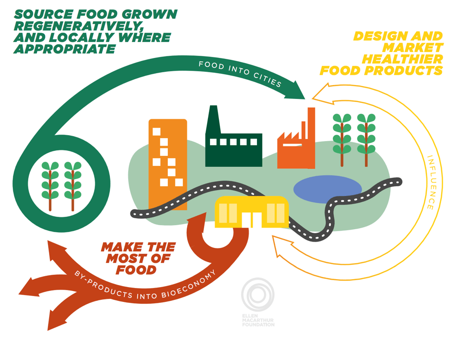 The Ellen MacAthur Foundation เสนอวิสัยทัศน์การออกแบบระบบการผลิตอาหารขึ้นใหม่บนฐานแนวคิดของระบบเศรษฐกิจแบบหมุนเวียน ซึ่งเสนอให้ “อาหารมาจากแหล่งผลิตท้องถิ่น ในวิถีที่ฟื้นฟูทรัพยากรธรรมชาติ ของเสียถูกจัดการและนำไปใช้ให้เกิดมูลค่า อาหารที่ดีต่อสุขภาพต้องผลิตโดยไม่ใช้วิถีปฏิบัติที่เป็นอันตราย” หรือที่รายงานฉบับนี้ใช้คำว่า “Regenerative food production” โดยหลัก 3 ประการของการเปลี่ยนผ่านสู่แหล่งพลังงานหมุนเวียน ประกอบด้วย