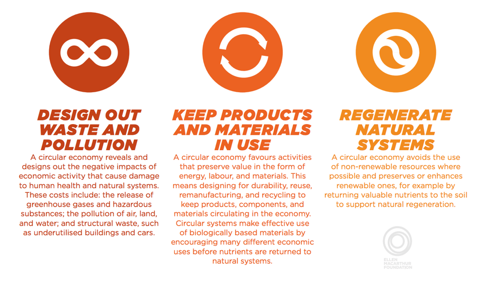 The Ellen MacAthur Foundation เสนอวิสัยทัศน์การออกแบบระบบการผลิตอาหารขึ้นใหม่บนฐานแนวคิดของระบบเศรษฐกิจแบบหมุนเวียน ซึ่งเสนอให้ “อาหารมาจากแหล่งผลิตท้องถิ่น ในวิถีที่ฟื้นฟูทรัพยากรธรรมชาติ ของเสียถูกจัดการและนำไปใช้ให้เกิดมูลค่า อาหารที่ดีต่อสุขภาพต้องผลิตโดยไม่ใช้วิถีปฏิบัติที่เป็นอันตราย” หรือที่รายงานฉบับนี้ใช้คำว่า “Regenerative food production” โดยหลัก 3 ประการของการเปลี่ยนผ่านสู่แหล่งพลังงานหมุนเวียน ประกอบด้วย