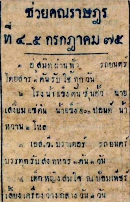 “ผู้ให้ของคณราษฎร ๑. นายชาย ตฤษนานนท์ ช่วยน้ำแข็ง ๑๐๐ ปอนด์ ๒. นายเป้า ชินพานิช นางจู ชินพานิช นางสาวมาลัย ชินพานิช ให้ลิ้นจี่ดอง ๔๐ ไห ลิ้นจี่สด ๑ ปี๊บ…๖. นายเทียนเลี้ยง กรรณสูตร ห้างสุพรรณพานิช ให้หีรูปแบตเตอรีสำหรับใส่บุหรี่ 2 โหล และสมุดพก ๒ โหล ๗. นายชิต นภาศัพท์ ยานัตถ์หมอชิต ๕๐๐ ขวด กล้องเป่ายา ๔๕๐ อัน…๙. พระพิพัฒน์วรรณกิจ บุหรี่การิค ๒ กระป๋อง บุหรี่ไพ่ป็อก ๑๗ กระป๋อง…๑๑. ห้างบาโรเบราน์ ยินดีรับซ่อมรถยนตร์มอริสที่ซื้อจากห้าง ซึ่งใช้ชำรุดในคราวนี้…๑๔. นาย เอฟ. เอ. พีเบอร์สัน โรงน้ำแข็งสีลม น้ำแข็ง ๕๐๐ ปอนด์…๑๘. บริษัท สุพรรณพานิช ช่วยเรือเร็วสำหรับเดิรหนังสือไปจังหวัดพระประแดงทั้งไปและกลับ ๑๙. นายเส็ง เบ๊ยู่เส็ง ตำบลเวิ๊งนครเกษม ช่วยเงิน ๕ บาท ๒๐. พระพิพิธสาลี บ้านปากคลอง วัดดาวดึงส์…ได้มอบพิมพ์ดีดสมิทพรีเมีย ราคา ๑๐๐ บาท ๑ เครื่อง กับพระพุทธรูปทองคำหน้าตักกว้าง ๙ ม.ม. สูง ๑๕ ม.ม. ๗ องค์ ๒๑. บริษัทแมดฟาแลนด์พิมพดีด จำกัด ได้มอบเครื่องพิมพ์ดีดเรมิงตันขนาดใหญ่อักษรไทย ๑ เครื่อง อักษรฝรั่งเศส ๑ เครื่อง…๒๔. นายมังกร สามเสน เข้าห่อ ๑๐๐ ห่อ…” [12]
