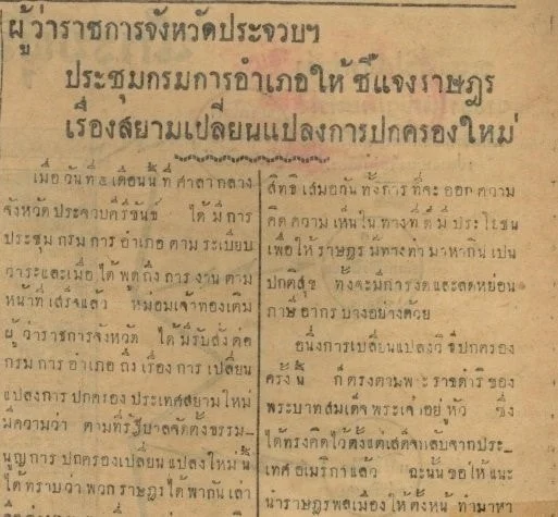 ตัวอย่างเช่นที่ จ.ประจวบคีรีขันธ์ มีการประชุมกรมการอำเภอตามระเบียบวาระเมื่อวันที่ 5 กรกฎาคม พ.ศ. 2475 หลังจากที่กล่าวถึงงานตามหน้าที่เสร็จสิ้น ทางหม่อมเจ้าทองเติม ผู้ว่าราชการจังหวัดฯ ได้มีรับสั่งต่อกรมการอำเภอเรื่องเปลี่ยนแปลงการปกครองประเทศสยามใหม่ มีใจความว่า