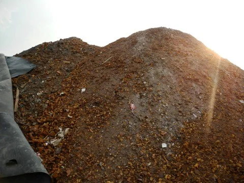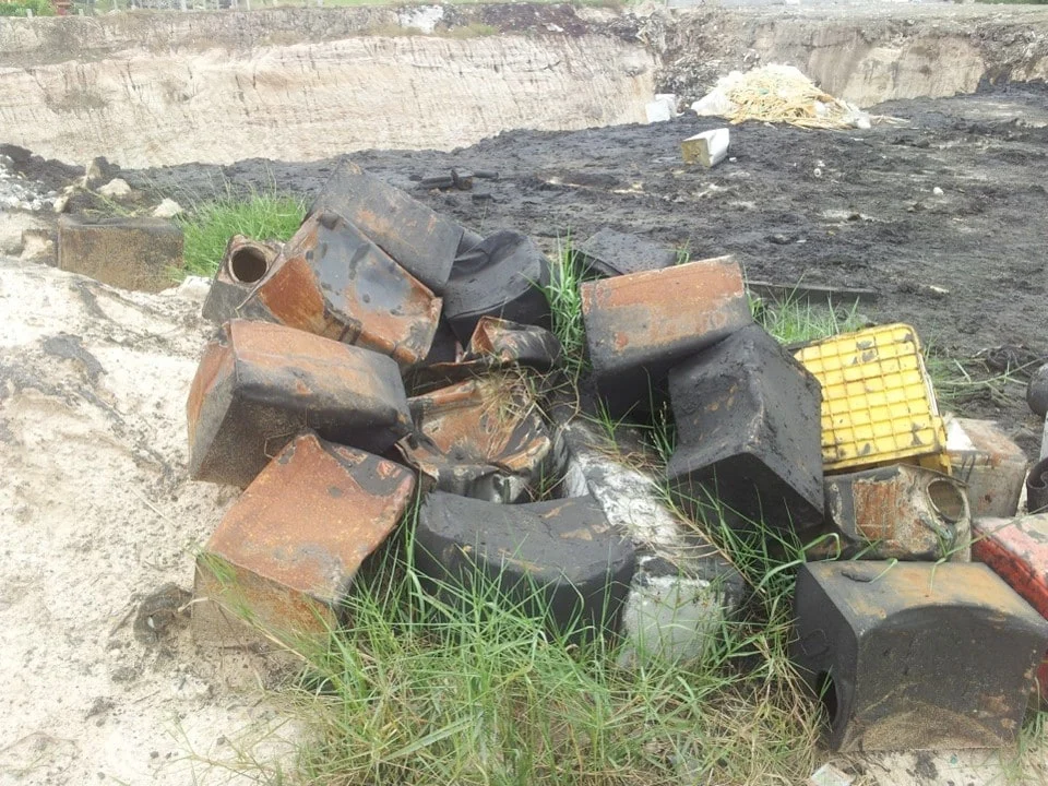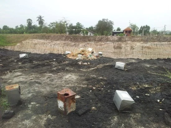 ในบ่อน้ำ เต็มไปด้วยเศษซากจากอุตสาหกรรม มีทั้งซากทีวีซึ่งหน้าจอฉาบด้วยสารปรอท ชิ้นส่วนต่างๆ ของรถยนต์ ซากเบาะ ไส้กรอง และเครื่องยนต์ที่ปนเปื้อนไปด้วยคราบน้ำมันต่างๆ ชิ้นส่วนที่ใช้ในการผลิตเครื่องปรับอากาศ ชิ้นส่วนโฟมที่ใช้ในการผลิตตู้เย็น และของเสียอันตรายอีกหลายชนิด ถูกทิ้งอยู่ในบ่อที่ไม่มีการปกคลุมด้วยวัสดุใดๆ เลย จึงเห็นได้ชัดว่าน้ำฝนส่งผลให้ซากอุตสาหกรรมเจือปนลงไปในดิน แถมยังเป็นซากอุตสาหกรรมที่ผ่านการถูกเผาไหม้มาแล้วด้วย แทบไม่ต้องสงสัยเลยว่า นี่เป็นแหล่ง ‘ลักลอบทิ้ง’ ของเสียจากภาคอุตสาหกรรม ซึ่งถูกตรวจพบมาตั้งแต่ต้นปี 2556 และถูกทิ้งร้างไว้เป็น ‘ของกลาง’ ในระหว่างดำเนินคดี โดยไม่ถูกนำไปบำบัด