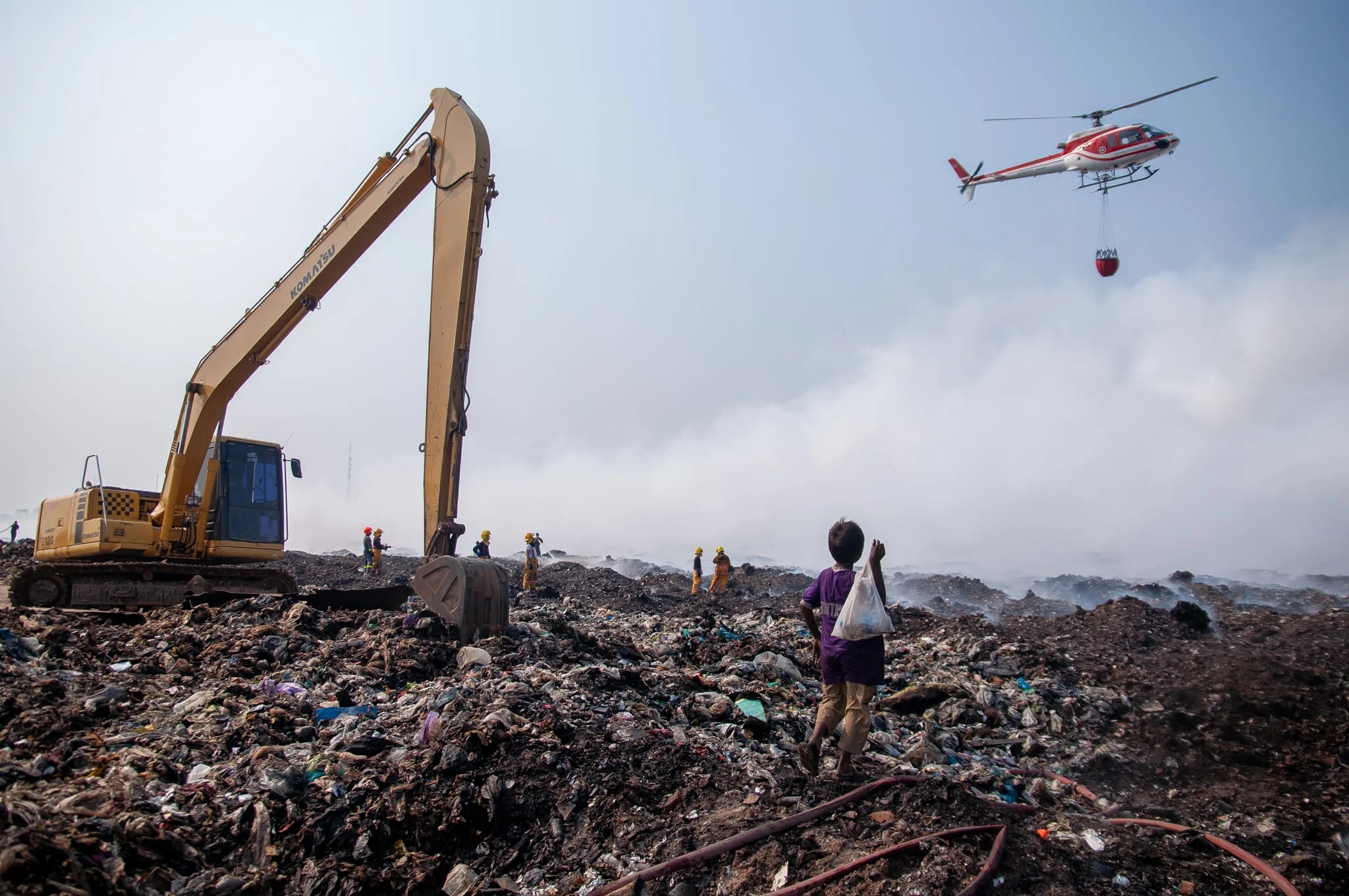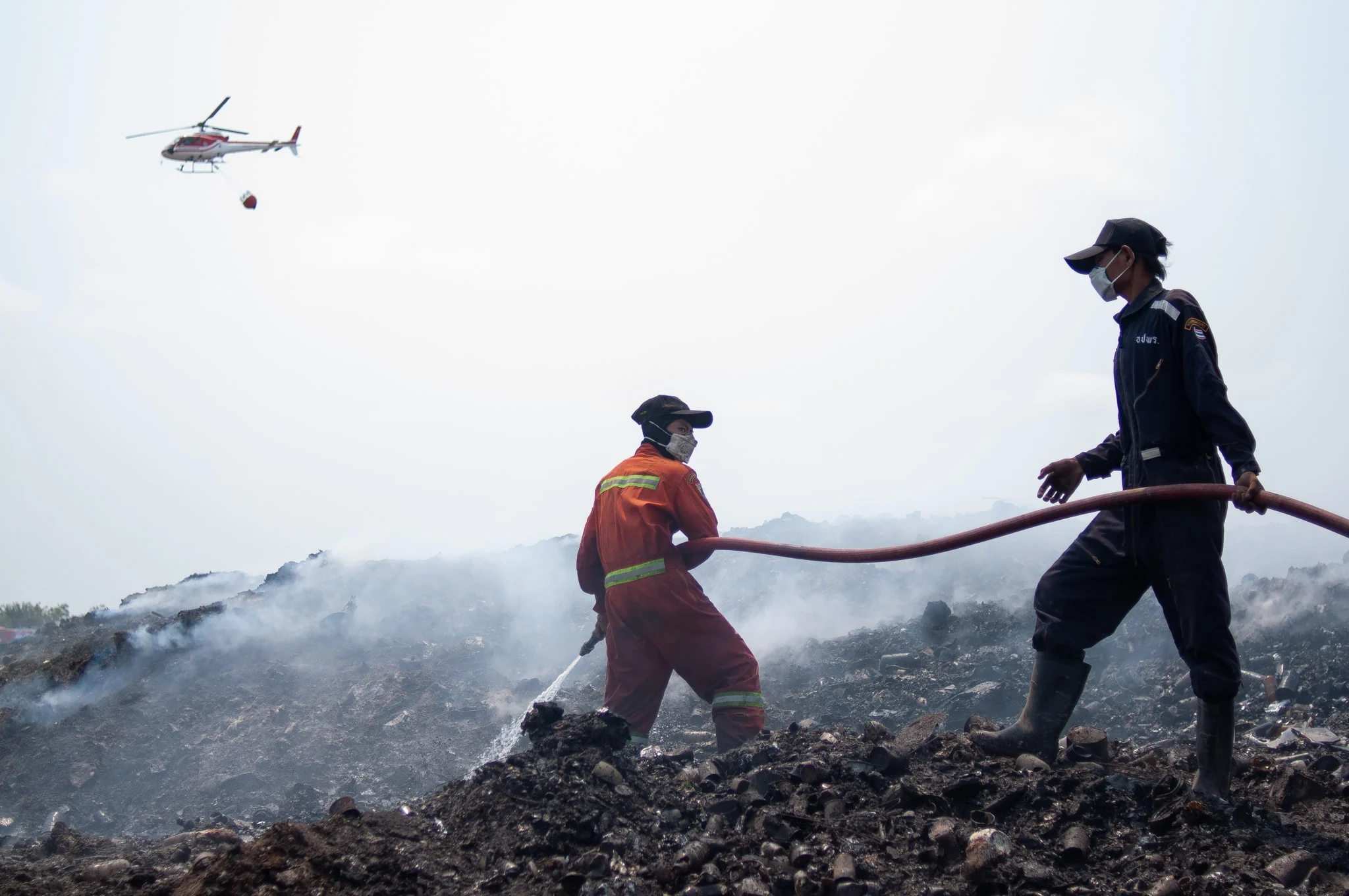 เราเข้าไปถึงที่เกิดเหตุ สิ่งที่เห็นคือภูเขากองขยะกว้างสุดลูกหูลูกตา กำลังถูกเพลิงลุกโหมส่งควันสีดำทะมึนลอยฟุ้งขึ้นไปบนอากาศไม่ขาดสาย เจ้าหน้าที่ต้องใช้รถแบคโฮเข้าไปช่วยเกลี่ยกองขยะ ขณะที่นักดับเพลิงก็เข้าไปทำงานอย่างยากเย็น เพราะมีความเสี่ยงที่จะหลุดจมลงไปในกองขยะได้ทุกเมื่อ ด้านบนมีเฮลิคอปเตอร์บินว่อนเพื่อตักน้ำลงมาราดลงบนกองไฟเป็นความหวังเล็กๆ ช่วยทุเลาสถานการณ์อันเลวร้าย