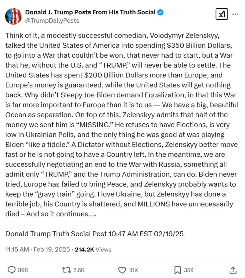 “ลองนึกดู, นักแสดงตลกที่ประสบความสำเร็จอย่างพอประมาณอย่างโวโลดีมีร์ เซเลนสกี (Volodymyr Zelenskyy) ได้โน้มน้าวให้สหรัฐอเมริกาใช้เงิน 350,000 ล้านดอลลาร์สหรัฐ เพื่อเข้าสู่สงครามที่ไม่มีทางชนะได้และไม่จำเป็นต้องเริ่มต้น แต่เป็นสงครามที่เขาจะไม่สามารถยุติได้หากไม่มีสหรัฐอเมริกาและ “TRUMP”. สหรัฐอเมริกาใช้เงินมากกว่ายุโรปถึง 200,000 ล้านดอลลาร์สหรัฐ และเงินของยุโรปก็ได้รับการประกันการจ่ายคืน ในขณะที่สหรัฐอเมริกาจะไม่ได้อะไรกลับมาเลย. ทำไมโจ ไบเดน (Joe Biden, อดีตประธานาธิบดี) ผู้สลึมสลือจึงไม่เรียกร้องความเท่าเทียม ในเมื่อสงครามครั้งนี้สำคัญต่อยุโรปมากกว่าเรามาก เรามีมหาสมุทรที่สวยงามและกว้างใหญ่เป็นเส้นแบ่งกั้น. นอกจากนี้ Zelenskyy ยังยอมรับว่าเงินครึ่งหนึ่งที่เราส่งไปให้เขา ‘หายไป’. เขาปฏิเสธที่จะมีการเลือกตั้ง เขามีคะแนนนิยมในยูเครนต่ำมาก และสิ่งเดียวที่เขาทำได้ดีคือการเล่นกลับไปกลับมาเหมือนเล่นซอกับ Biden. Zelenskyy ผู้เป็นเผด็จการที่ผ่านการเลือกตั้งต้องรีบดำเนินการ ไม่เช่นนั้นเขาจะไม่มีประเทศเหลืออยู่ ในระหว่างนี้เรากำลังเจรจายุติสงครามกับรัสเซียสำเร็จ ซึ่งทุกคนยอมรับว่ามีเพียง “TRUMP” และรัฐบาล TRUMP เท่านั้นที่ทำได้ Biden ไม่เคยพยายาม ยุโรปล้มเหลวในการนำสันติภาพมาให้ และ Zelenskyy อาจต้องการให้ “ขบวนรถไฟเหาะ” ดำเนินต่อไป ฉันรักยูเครน แต่ Zelenskyy ทำหน้าที่ได้แย่มาก ประเทศของเขาพังทลาย และผู้คนนับล้านต้องเสียชีวิตโดยไม่จำเป็น และสิ่งนี้ยังคงดำเนินต่อไป…..”
