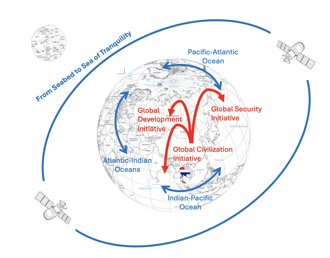 แผนภาพข้างต้นจึงน่าจะสรุปสถานการณ์ปัจจุบันได้อย่างดีที่สุด นั่นคือ ประเทศไทยที่เป็นประเทศอำนาจกลาง (Middle Power) ตั้งอยู่ในท่ามกลางการปะทะของนโยบายการต่างประเทศของจีนที่ขยายอิทธิพลและแสวงหาพันธมิตรผ่าน 3 เสาหลัก GDI, GSI และ GCI โดยมีสหรัฐฯ และพันธมิตรที่พยายามอย่างยิ่งในการใช้มหาสมุทรในการปิดล้อม ไม่ว่าจะเป็นนโยบายกลับเข้ายึดครองคลองปานามา และการป้องกันการสร้างคลอง Nicaragua โดยทุนสนับสนุนของจีน หรือการสร้างเส้นทางขั้วโลก North-West Passage (NWP) จาก California – Alaska – Canada – Greenland – Europe ทางเลือกเพื่อลดการผูกขาดของจีนและรัสเซียบนเส้นทาง North Sea Route (NSR) จาก จีน – รัสเซีย – ยุโรป เพื่อใช้มหาสมุทรแปซิฟิก – มหาสมุทรแอตแลนติกในการปิดล้อม หรือการสร้างพันธมิตรสหรัฐฯ-อิสราเอล ที่มีส่วนสำคัญในการแทรกแซงกิจการในตะวันออกกลาง และการสร้างคลอง Ben-Gurion หรือคลองสุเอชแนวที่ 2 เพื่อเชื่อมโยงมหาสมุทรแอตแลนติก สู่ มหาสมุทรอินเดีย