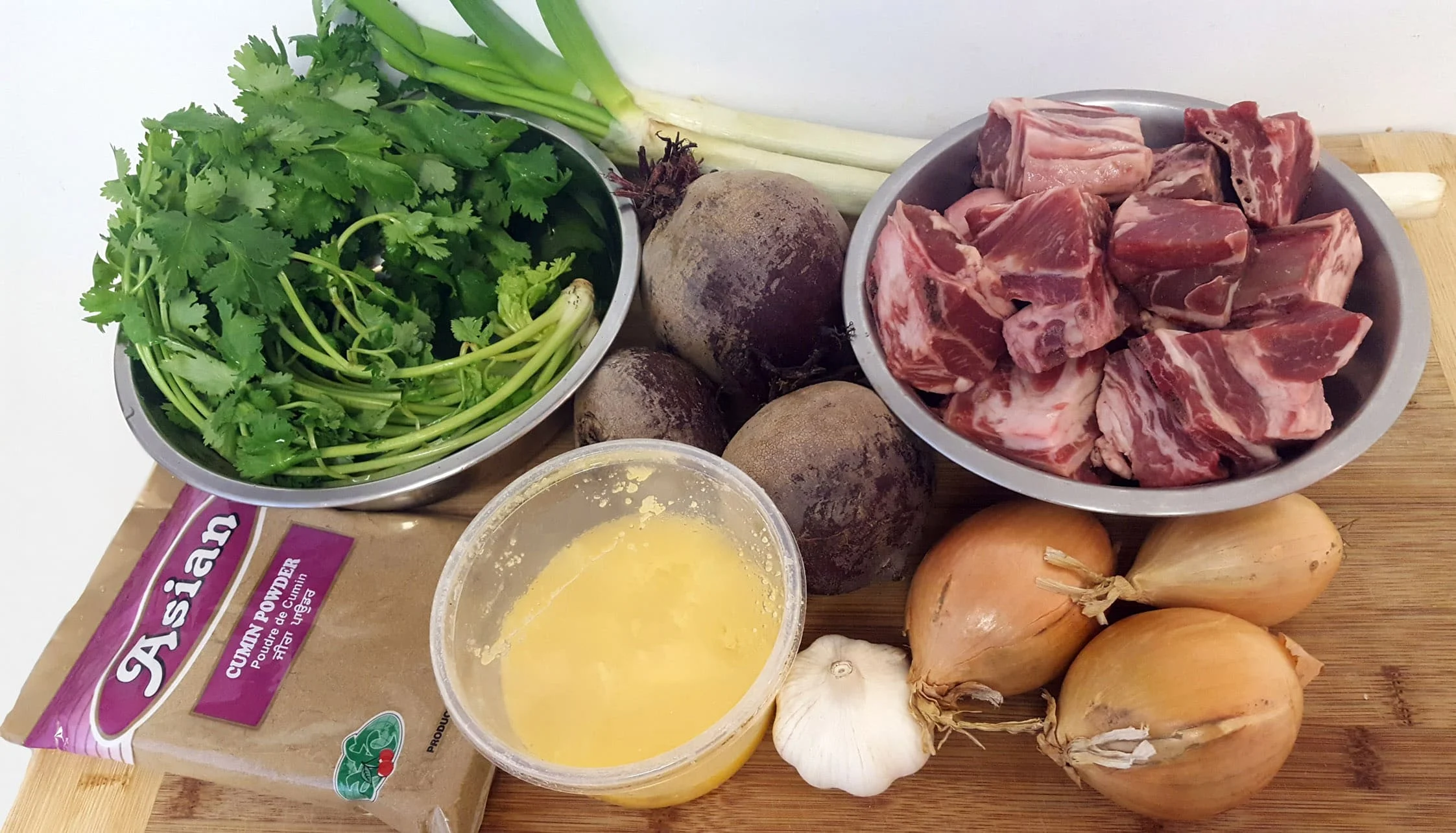 วัตถุดิบ เนื้อขาแกะ ½ กิโลกรัม หัวบีทแดง 3 หัว หอมใหญ่ 3 หัว หอมแดง 1 หัว ต้นหอมขาว หรือ ลีค 3 ต้น เนยเหลว 2 ช้อนโต๊ะ เบียร์ 1 ถ้วยตวง น้ำสะอาด 3 ถ้วยตวง ยี่หร่าป่น 1 ช้อนโต๊ะ ลูกผักชีป่น 1 ช้อนโต๊ะ ผักชี 10 ต้น กระเทียมประมาณ 10 กลีบและ เกลือ 1 ช้อนชา