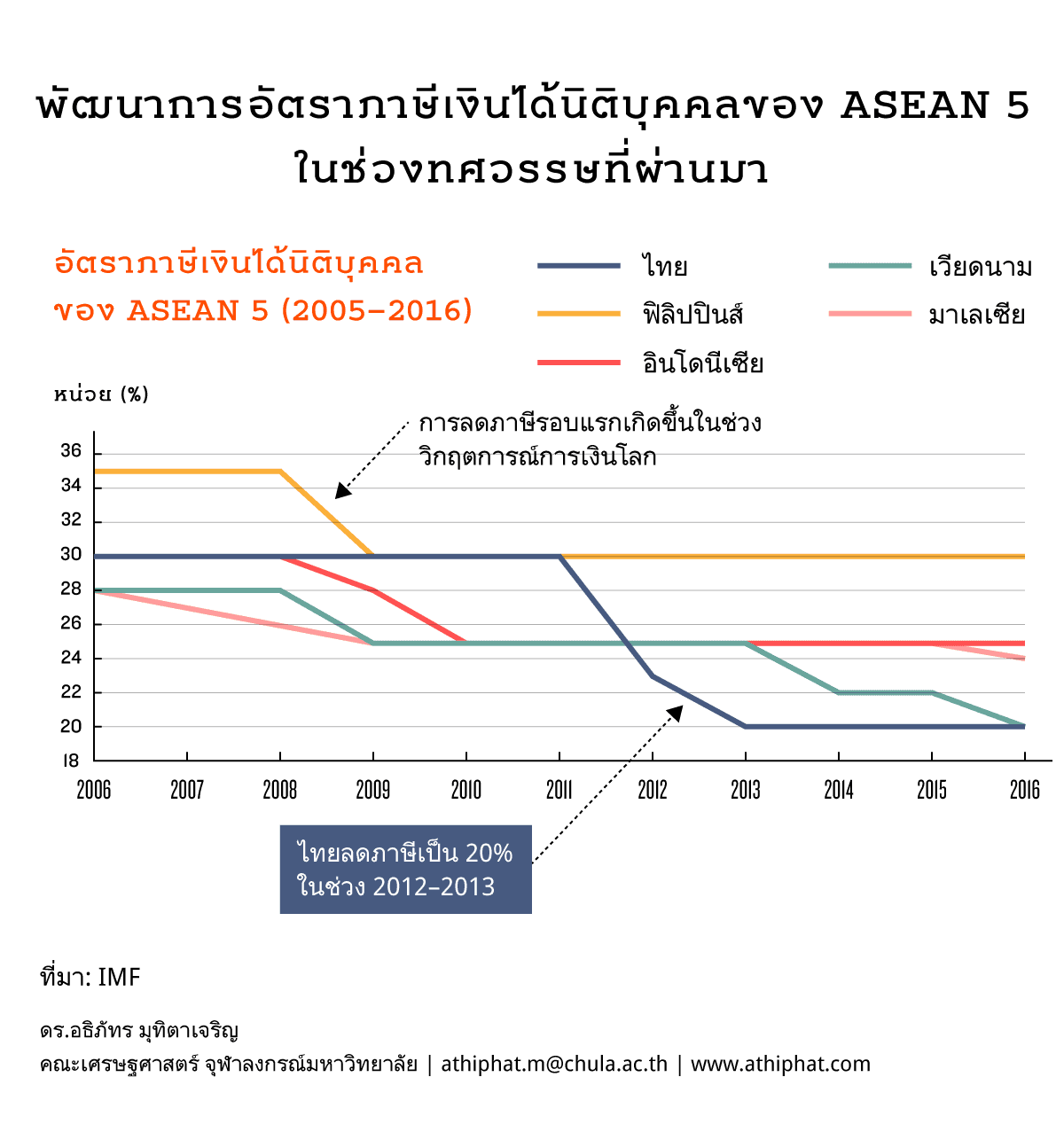 ในช่วง 10 กว่าปีที่ผ่านมา ไทยกับประเทศอาเซียนมีการแข่งขันกันลดภาษี รอบแรกเกิดขึ้นในช่วงปี 2008 เมื่อเกิดวิกฤตการณ์การเงินในสหรัฐอเมริกา ถ้าดูจากกราฟจะเห็นว่า ในช่วงแรกทุกประเทศยกเว้นไทยปรับลดอัตราภาษีลงมาหมด ไทยปรับนโยบายค่อนข้างช้า แต่ว่าปรับแรง ในปี 2011-2013 เราลดภาษีเงินได้นิติบุคคลลงจาก 30% เป็น 20% ซึ่งทำให้สถานะของประเทศไทยเปลี่ยนจากประเทศภาษีสูงเป็นประเทศภาษีต่ำทันที