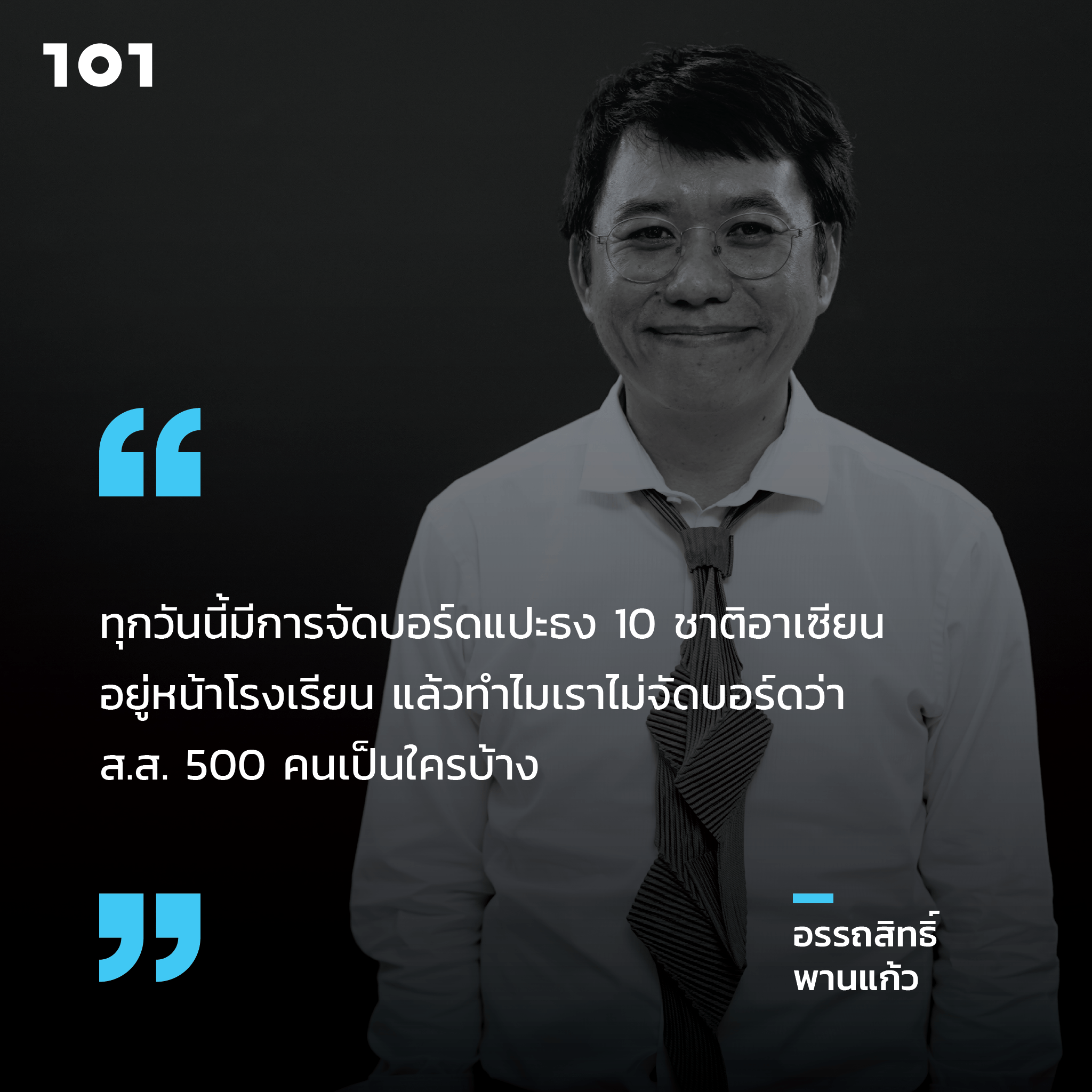 การที่คนรุ่นใหม่ตอบได้ว่าอาเซียนมีกี่ประเทศ เพราะเป็นสิ่งที่โรงเรียนสอน และสะท้อนให้เห็นว่าถ้าโรงเรียนอยากจะสอนเรื่องการเมือง มันทำได้ทั้งนั้นแหละ ทุกวันนี้มีการจัดบอร์ดแปะธง 10 ชาติอาเซียนอยู่หน้าโรงเรียน แล้วทำไมเราไม่มีจัดบอร์ดว่า ส.ส. 500 คนเป็นใครบ้าง เดี๋ยวนี้เรียนวิชาสังคมศึกษาเรายังสอนเรื่องพวกนี้ไหม ประชาธิปไตยในโรงเรียนเราสอนกันอย่างไรล่ะ