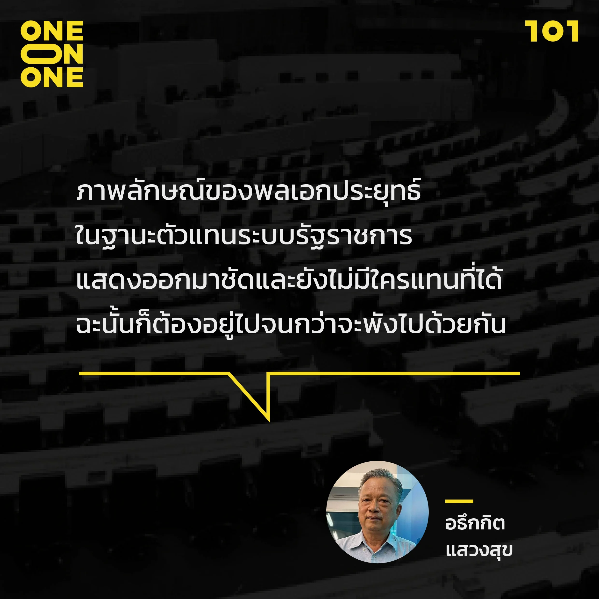 ภาพลักษณ์ของพลเอกประยุทธ์ในฐานะตัวแทนระบบรัฐราชการแสดงออกมาชัดมาก เช่น การออกมาสั่งการทุกอย่าง หรือถ้าเกิดปัญหาอะไรก็โทษประชาชน การมองว่าตัวเองดีหมดทุกอย่างและอยู่เหนือประชาชน ทั้งหมดนี้คือลักษณะของพลเอกประยุทธ์ที่เป็นตัวแทนรัฐราชการ ซึ่งผมคิดว่าด้วยลักษณะแบบนี้ จะหาใครมาแทนที่พลเอกประยุทธ์ก็ยังไม่มี ฉะนั้นก็ต้องอยู่ไปจนกว่าจะพังไปด้วยกัน
