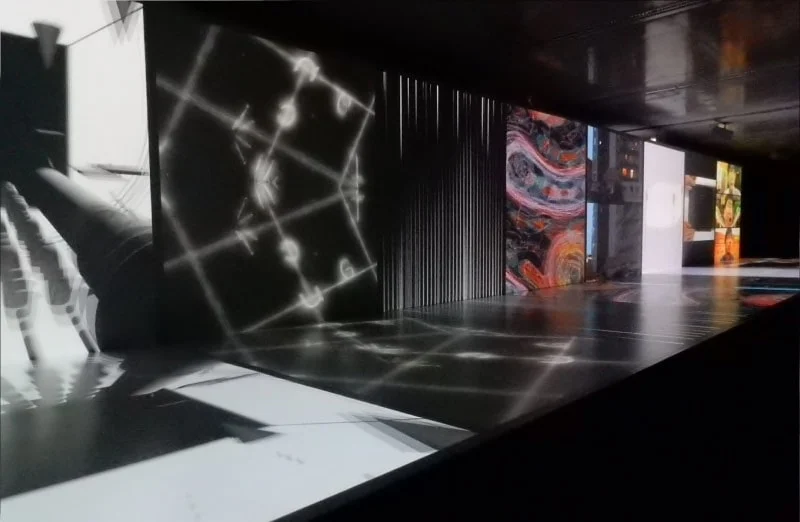 เดินลงบันไดไปสู่ตัวนิทรรศการหลัก ความประทับใจแรกรอเราอยู่ตั้งแต่ปากทางเข้า ด้วยป้ายชื่องานที่ฉายด้วยโปรเจ็กเตอร์ที่เคลื่อนไหว บิดเบี้ยว เปลี่ยนรูปทรง คล้องไปกับเสียงดนตรีที่ดังลอดออกมา