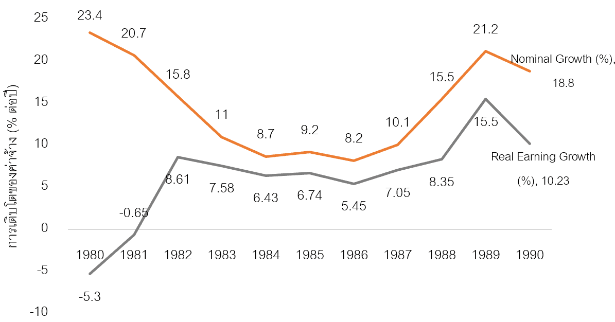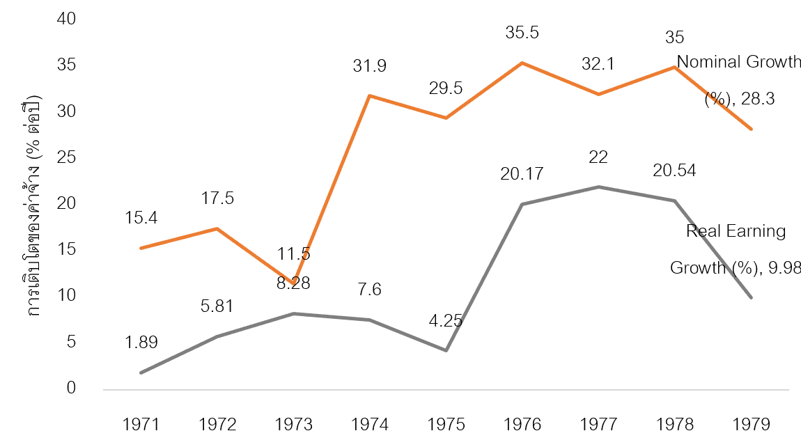 ผลของการต่อสู้เรียกร้องเหล่านี้ส่งผลให้ค่าจ้างเกิดการปรับตัวสูงขึ้น หลังปี 1973 อัตราการขยายตัวของค่าจ้างก่อนหักเงินเฟ้อ (Nominal growth) ขยายตัวราว 30% ต่อปี และเมื่อหักเงินเฟ้อออก (Real earning growth) ค่าจ้างในเกาหลีใต้ช่วงครึ่งหลังของทศวรรษที่ 1970s เติบโตอย่างรวดเร็วถึงราว 20% ต่อปี ซึ่งเป็นอัตราที่สูงมาก (ภาพที่ 3)