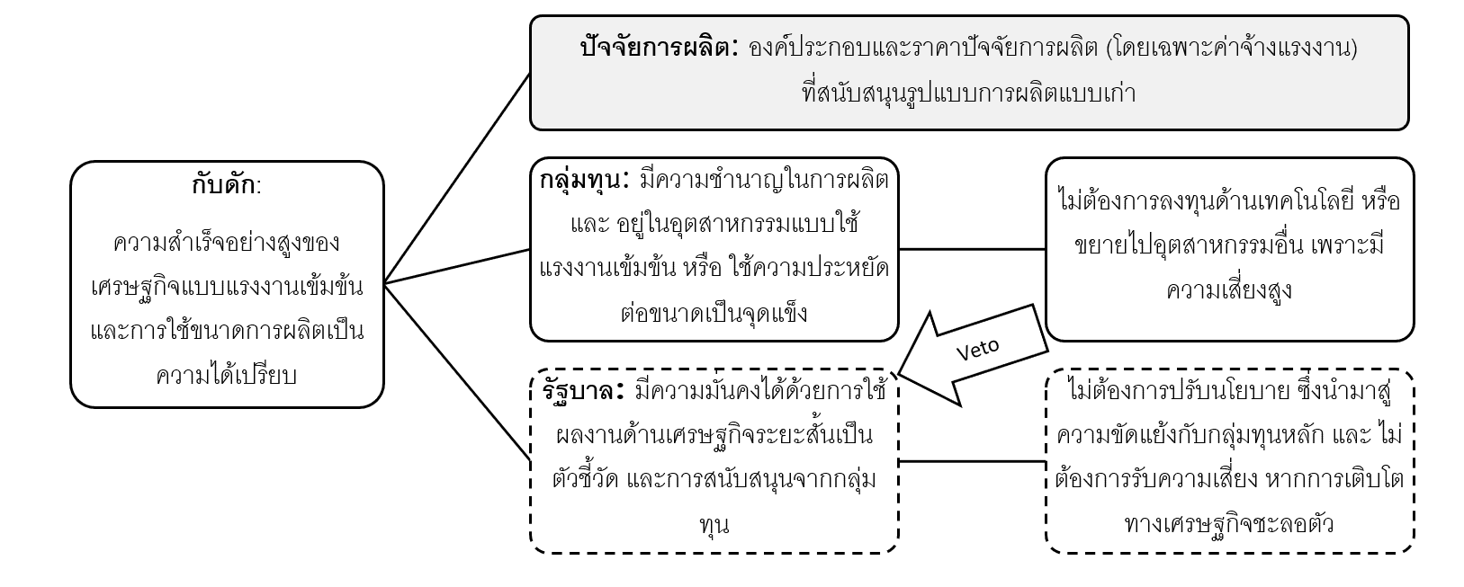 นอกจากนี้ การถักทอเครือข่ายผลประโยชน์ทางเศรษฐกิจการเมืองระหว่างรัฐบาลและกลุ่มทุน ทำให้รัฐไม่ต้องการที่จะดำเนินมาตรการซึ่งก่อให้เกิดผลเสียต่อกลุ่มทุนหลัก และหากมีมาตรการใดที่เป็นภัยต่อผลประโยชน์ระยะสั้นของกลุ่มทุน ก็อาจถูกคัดค้าน (Veto) ได้ง่าย