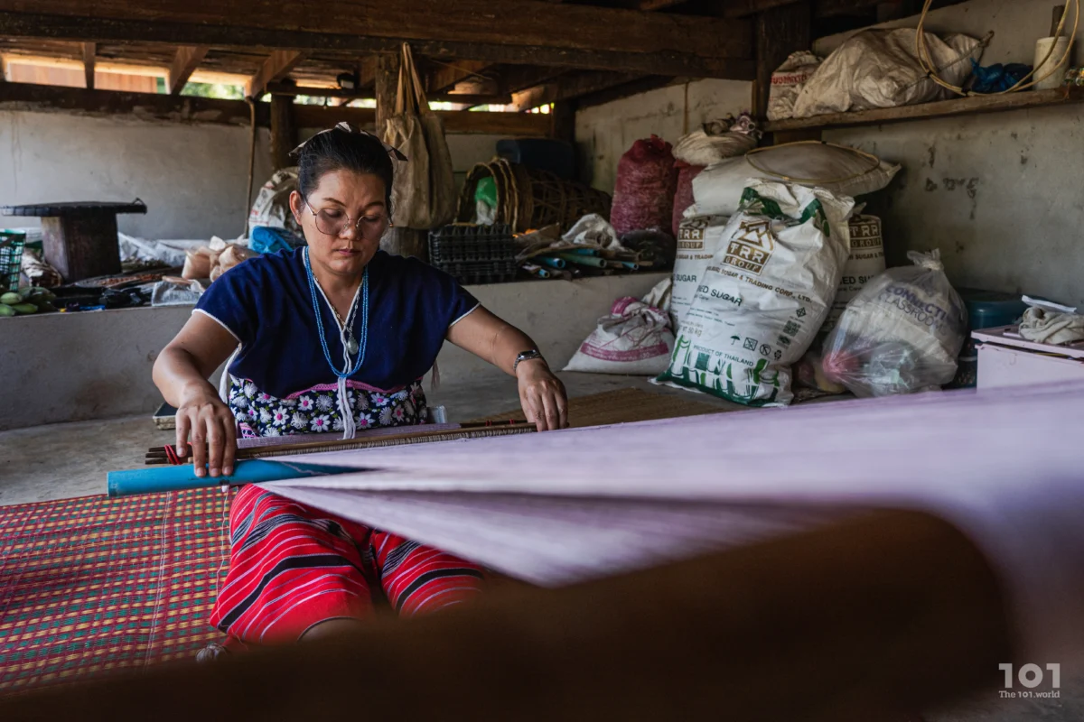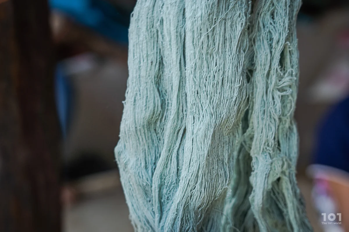 “เราใช้เท้า ใช้เอว ใช้มือ มีหลายองค์ประกอบอยู่ในนี้” แม่ลัดดาเล่าถึงกระบวนการทอผ้าที่สืบทอดกันมาในชุมชน โดยเฉพาะงานทอเสื้อที่ย้อมสีเอง ทอกันเองแทบทุกขั้นตอน งานผ้าทอของที่นี่ไม่ได้ใช้กี่กระตุกทั่วไปที่ครั้งหนึ่งสามารถผลิตได้หลายผืน แต่ทอด้วย ‘กี่เอว’ ที่ผู้ทอต้องนั่งเหยียดขา ผูกสายคาดเอว และใช้การขยับเอวบังคับเส้นด้าย พี่แป้งเล่าว่านี่เป็นเหตุที่ทำให้ราคาค่อนข้างสูงกว่าผ้าทอทั่วไป เพราะทำทุกขั้นตอนด้วยมือ ใช้เวลาเป็นหลักวันหรือ 3-4 วันกว่าจะได้หนึ่งผืน