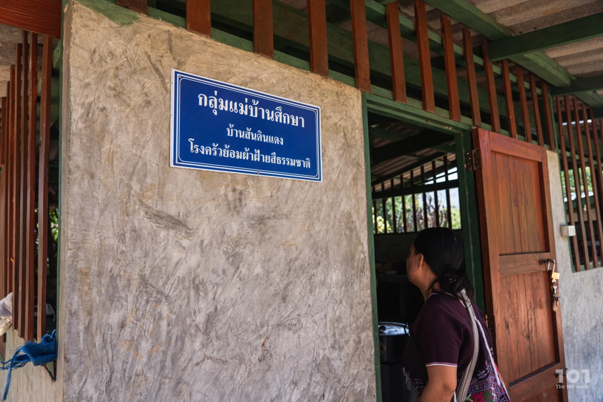 เราออกจากไร่หมุนเวียน ข้ามลำธารใส ก่อนจะเดินขึ้นเนินสูงตามแม่ลัดดาไปที่บ้านของพี่ส่งสุข ลีลาพนาสวัสดิ์ และพี่สุวรรณี ลีลาพนาสวัสดิ์ ผู้เป็นภรรยา อย่างที่เล่าไปก่อนหน้านี้ว่านอกจากการทำไร่หมุนเวียนแล้ว กลุ่มสตรีบ้านสันดินแดงประกอบอาชีพทอผ้า บ้านหลังนี้คือหนึ่งในตัวอย่างของวิถีชีวิตที่ทอผ้าเป็นหนึ่งในสัญลักษณ์ของชุมชนพึ่งพาตนเอง