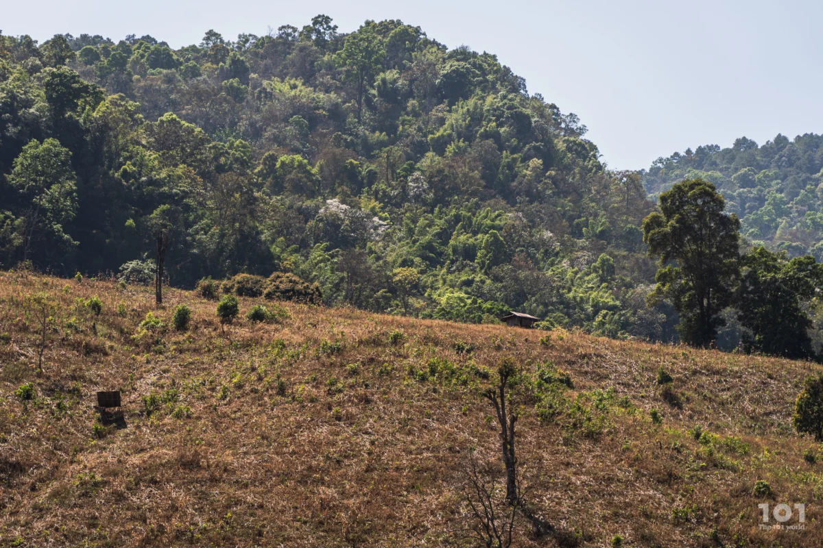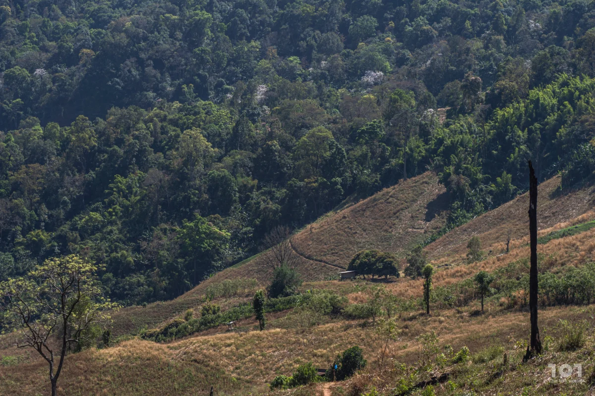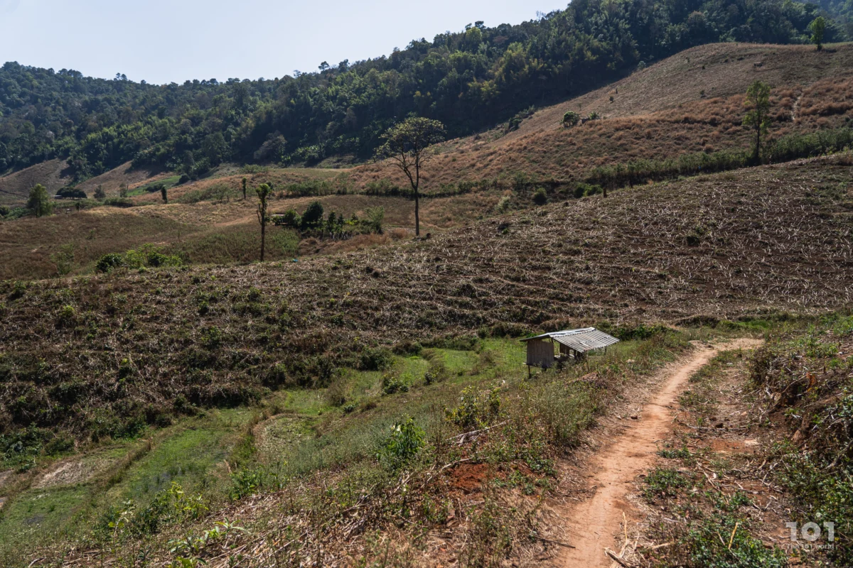 อีกฟากหนึ่งของชุมชนคือท้องไร่ไกลสุดสายตาทอดยาวบนภูเขาลูกใหญ่ แต่กระนั้น สิ่งที่ย้อนแย้งอย่างยิ่งคือทุกวันนี้พี่น้องปกาเกอะญอบ้านสันดินแดงกลับค่อยๆ ถูกจำกัดสิทธิในผืนดินที่ตนดูแลรักษามาโดยตลอด ทั้งที่ไร่หมุนเวียนไม่ได้ทำลายป่า แต่เป็นส่วนหนึ่งของวัฏจักรการฟื้นฟูตามธรรมชาติ ทว่ามาตรการของรัฐกลับไม่โอบรับวิถีชีวิตเหล่านี้ ทั้งที่ความต้องการของเขาเล็กน้อยเมื่อเทียบกับพื้นที่ป่าอนุรักษ์กว้างใหญ่