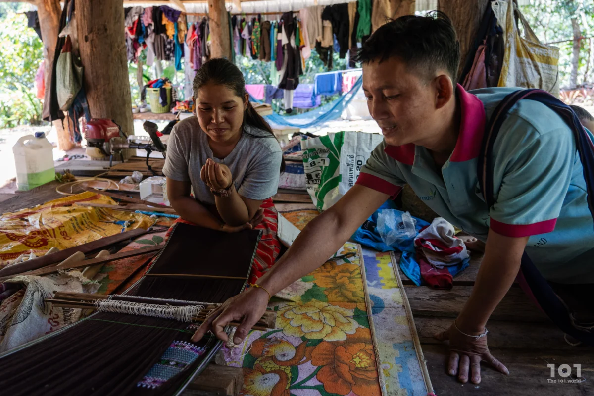 แม่ลัดดาพาเรามาที่บริเวณใกล้ศาลาประจำหมู่บ้านอีกครั้ง เดินไปไม่ใกล้ไม่ไกลก็มาถึงบ้านหลังหนึ่ง พี่แป้ง–วันเพ็ญ วิริยะวนา เจ้าของบ้านหลังนี้ต้อนรับเราและสาธิตการทอผ้าให้เราดูด้วยความเต็มใจ พร้อมเล่าให้เราฟังว่าเคยไปถ่ายทอดภูมิปัญญานี้ที่กรุงเทพฯ และมีชาวต่างชาติมาเรียนรู้