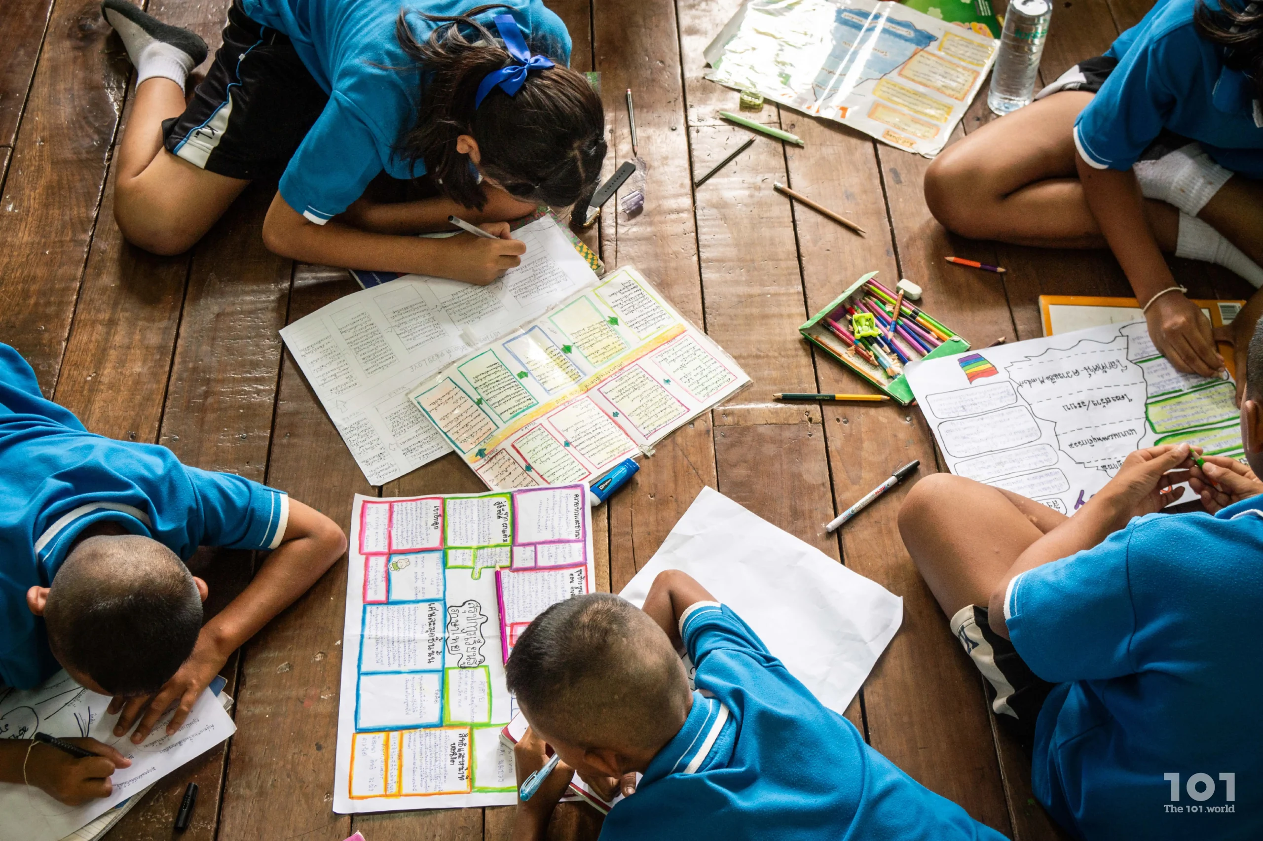 ยามบ่ายที่เราไปเยือน โรงเรียนดูเงียบสงบ แว่วเสียงพูดคุยของเด็กเบาๆ จากแต่ละห้องเรียน เมื่อลองชะโงกหน้าสำรวจห้องเรียนก็พบนักเรียนนอนกระจัดกระจายอยู่ที่พื้น วาดภาพระบายสีมายด์แมปเรื่องที่กำลังเรียนอย่างสบายอารมณ์ หากใครถนัดนั่งเขียนบนโต๊ะก็เลือกได้ มีโทรศัพท์มือถือวางข้างๆ เผื่อใช้ค้นคว้า โดยมีครูนั่งสังเกตการณ์การทำงานของเด็กแต่ละกลุ่มและชวนพูดคุยตั้งคำถามเป็นระยะ