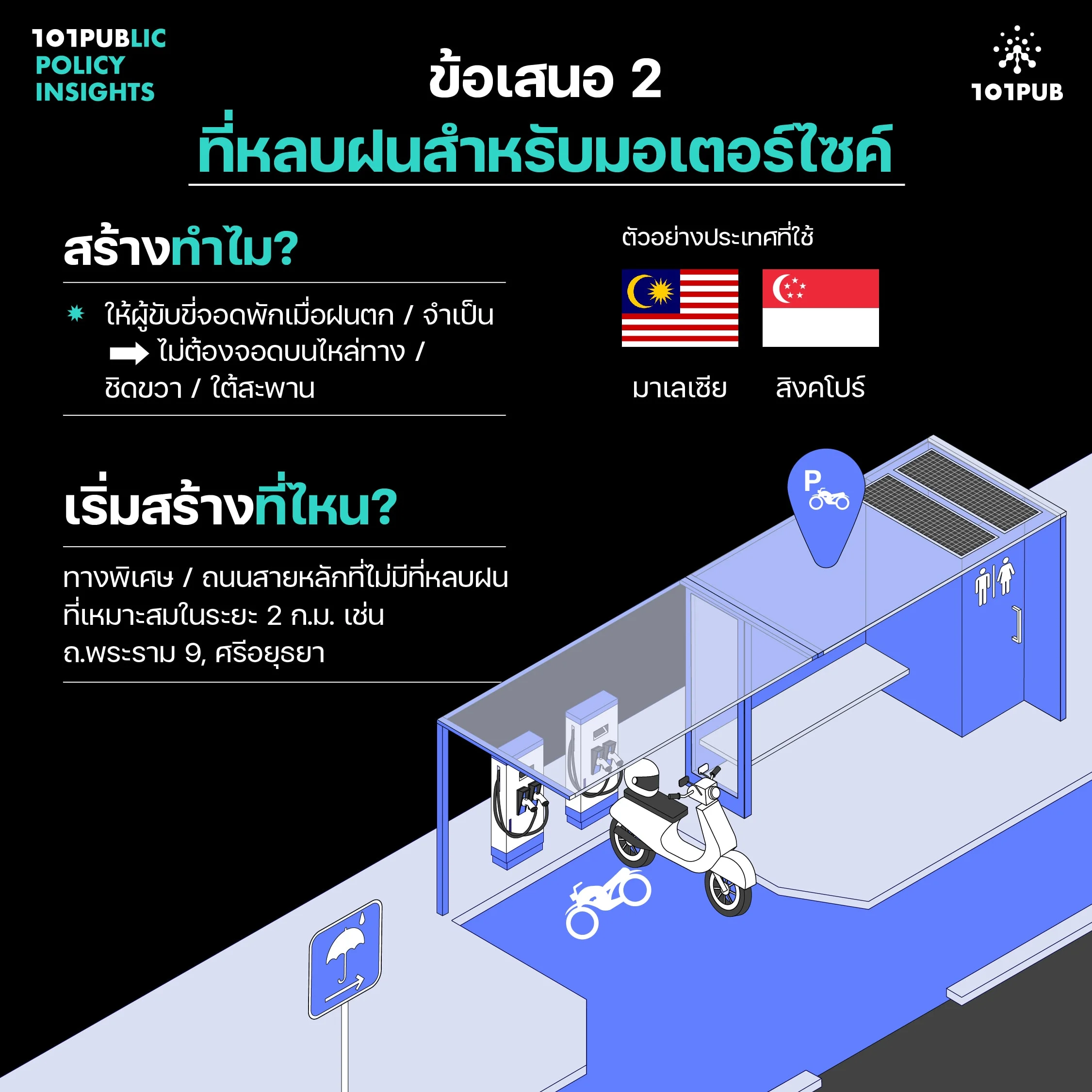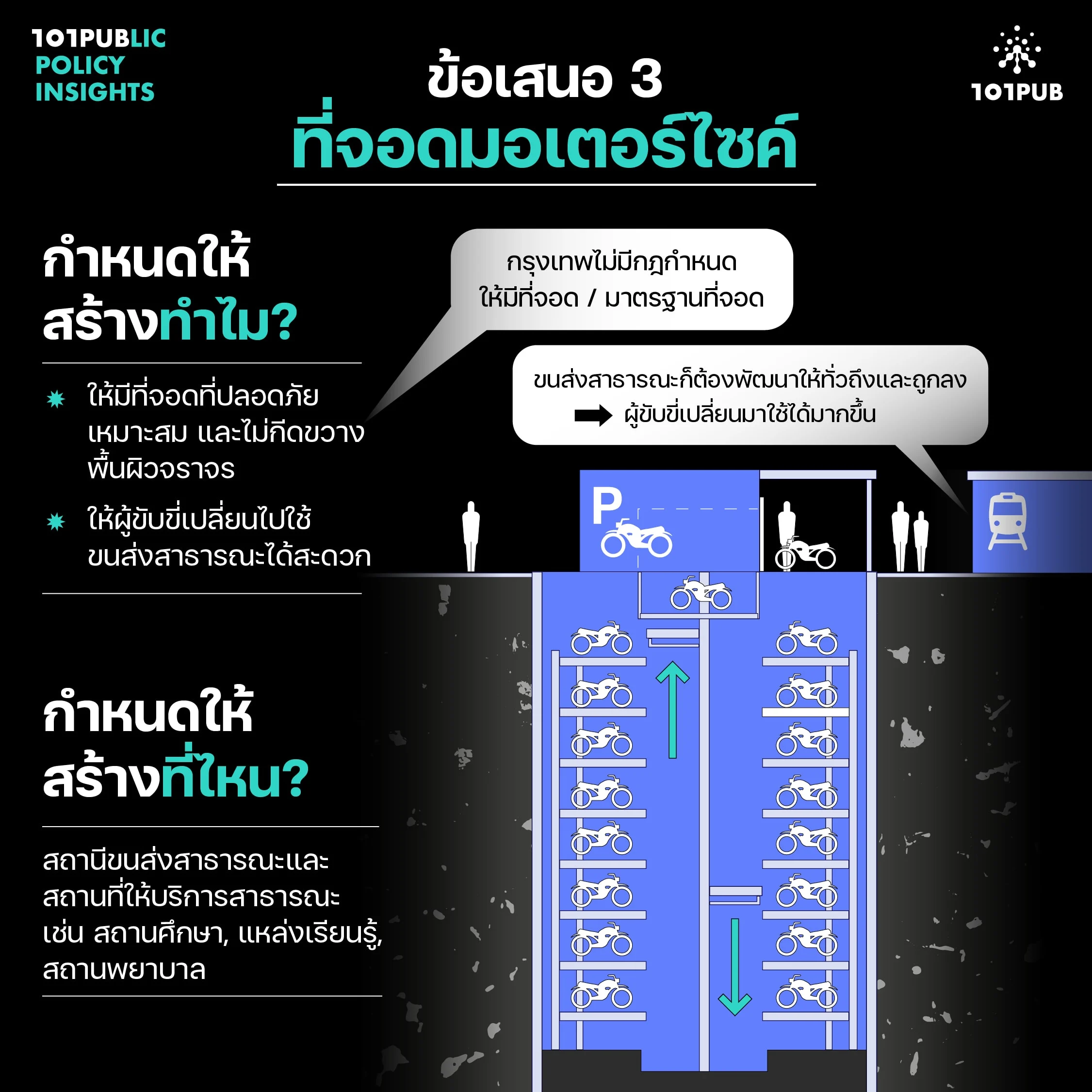 เมื่อตั้งหลักได้ดังนี้แล้ว 101 PUB เสนอว่ารัฐควรพิจารณาพัฒนาพื้นที่ 3 ประเภทในกรุงเทพฯ ได้แก่ เลนมอเตอร์ไซค์ ที่หลบฝนสำหรับมอเตอร์ไซค์ และที่จอดมอเตอร์ไซค์ เพื่อเปลี่ยนเงื่อนไขของเมืองใหม่ให้สามารถแก้ปัญหาได้