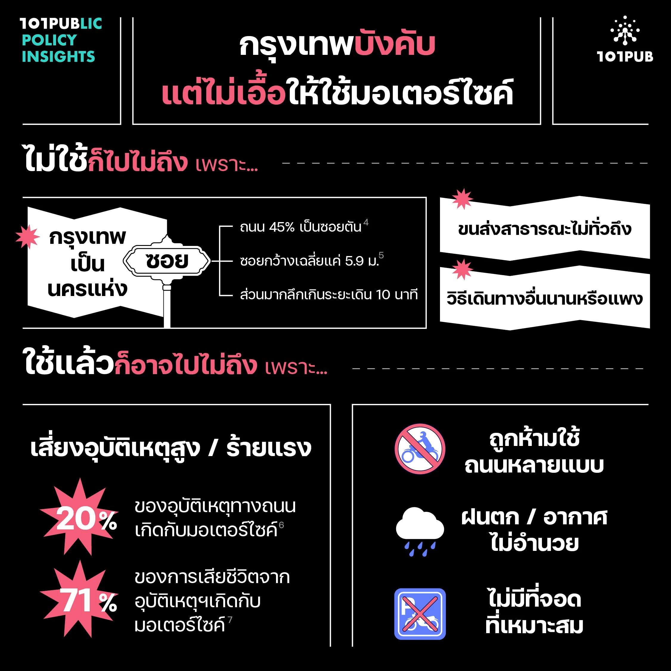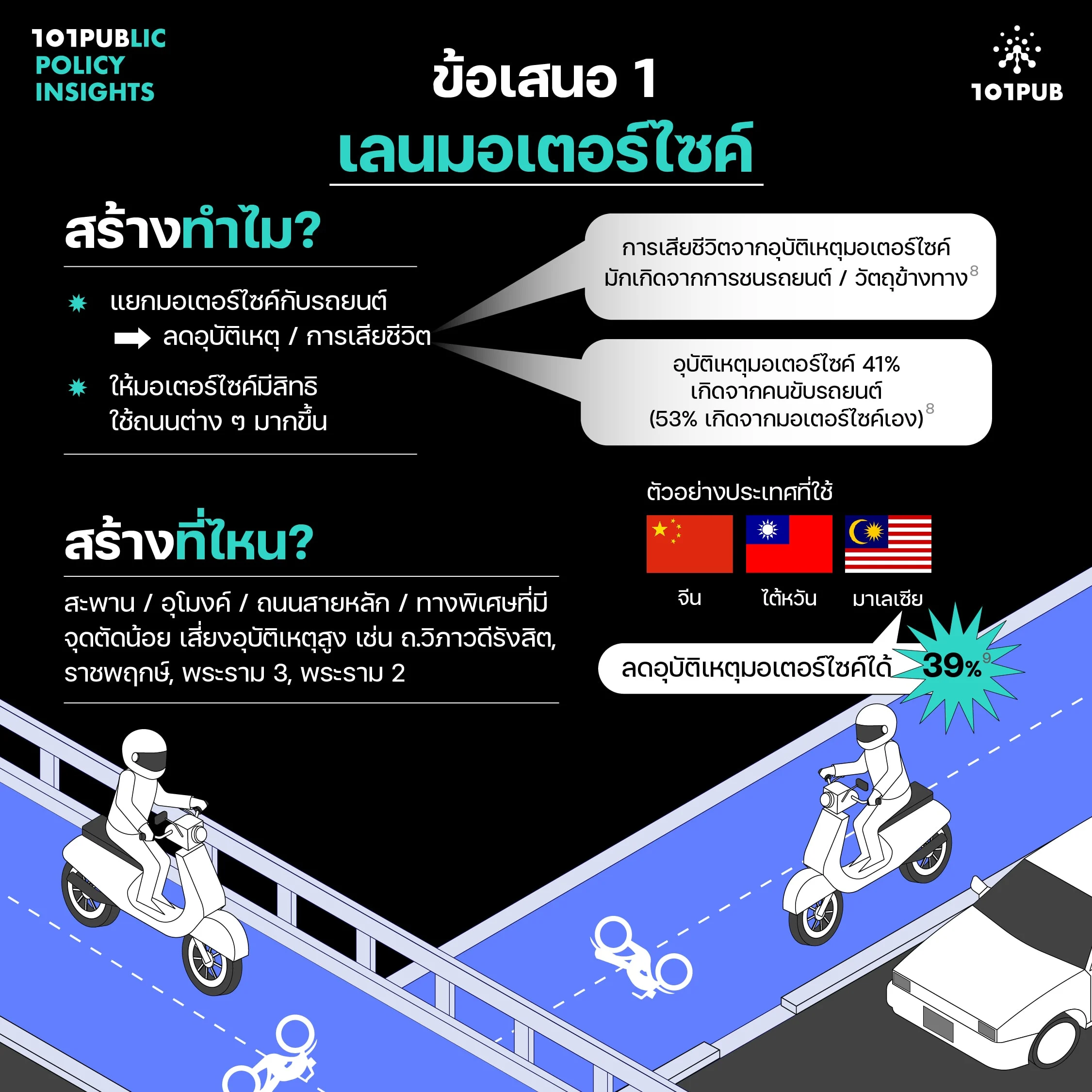 101 PUB (101 Public Policy Think Tank) ชวนผู้อ่านทำความเข้าใจ ‘ความสำคัญ’ และ ‘ความจำเป็น’ ของมอเตอร์ไซค์ต่อกรุงเทพฯ พร้อมทั้งสำรวจปัญหาของผู้ขับขี่ และเสนอแนวนโยบายด้านโครงสร้างพื้นฐาน เพื่อเป็นจุดเริ่มต้นในการส่งเสริมให้ผู้ขับขี่มีสิทธิบนท้องถนนเสมอหน้ากับผู้ใช้ถนนกลุ่มอื่นมากขึ้น ตลอดจนมีคุณภาพในการเดินทางและคุณภาพชีวิตที่ดียิ่งขึ้น